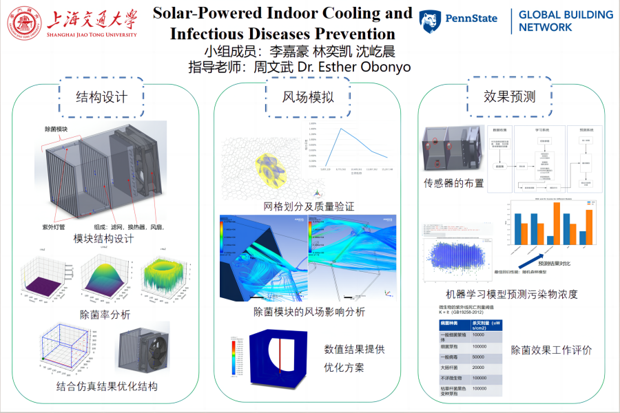 2023年夏季的高温威胁到世界上部分地区数百万人的生命。空调是人们在高温下维持基本生活质量必不可少的物件。同时,COVID-19疫情加强了传染病预防的重要性。在室内,病菌极易通过空气快速传播,所以空调系统尤其是中央空调会成为病菌传播的温床。在空调系统的基础上,添加除菌功能模块可以有效抑制空调系统内的病菌浓度,进而预防传染病在室内环境下的传播。本项目为买球官方网站和美国宾州州立大学的合作毕设项目,旨在基于太阳能空调原型机设计除菌模块,预防传染病的传播。
