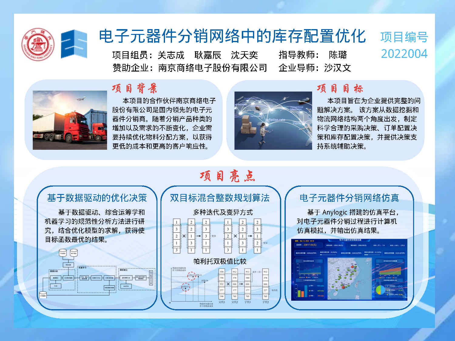 分析南京商络电子股份有限公司的分销业务,包括供应商、仓库、客户的性质和特点,整个流程的网络结构,充分挖掘商络积累的大量历史数据背后的潜在价值,结合仓库容量和配送价格等抽象现实中的约束和限制,通过构建数学模型、设计优化算法实现电子元器件分销网络的库存配置优化,制定具体的库存分配、库存调拨、库存配送的决策方案。此外,为了便于业务人员的使用,通过功能分析、需求拆解,设计用户友好、容易上手的决策支持系统加以封装,可视化地输出决策方案和展示决策效果。