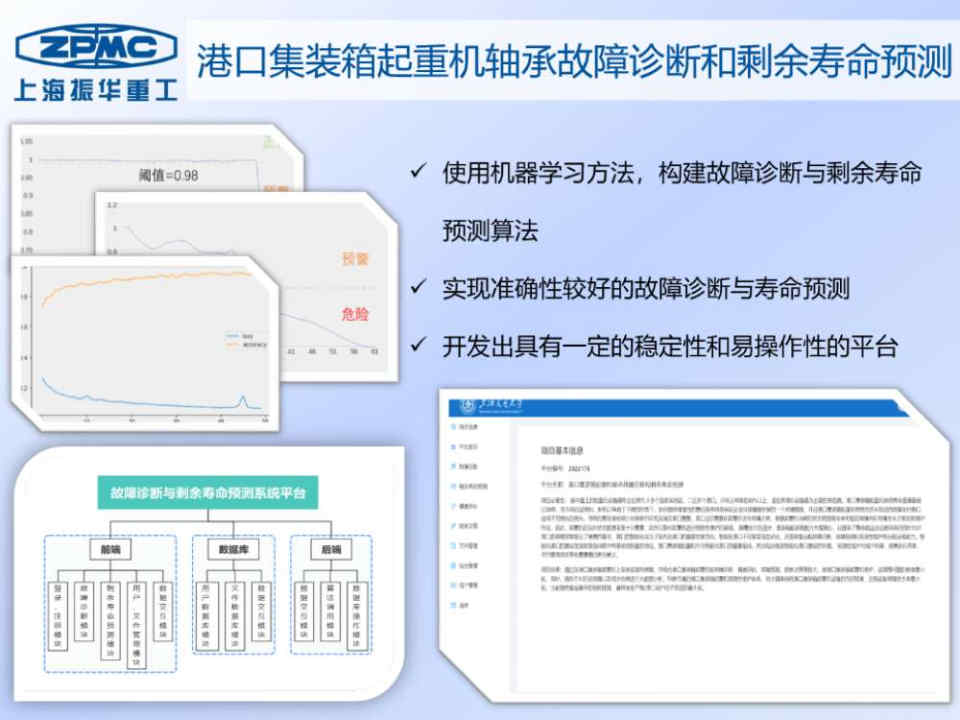 上海振华重工(集团)股份有限公司是世界港机设备最主要的供应商。在市场日益饱和、新机订单趋于下降的形势下,增值性的售后服务成为保证企业持续健康发展的关键。港口集装箱起重机突然性的未预见的故障会对港口造成不可预估的损失。传统的事后维修或计划维修已经无法满足港口需要,港口迫切需要在起重机发生故障之前,根据起重机当前的状态预测到未来可能的故障并在故障发生之前安排维护作业。本项目构建了港口集装箱起重机轴承的故障诊断和剩余寿命预测平台,辅助港机的维护。