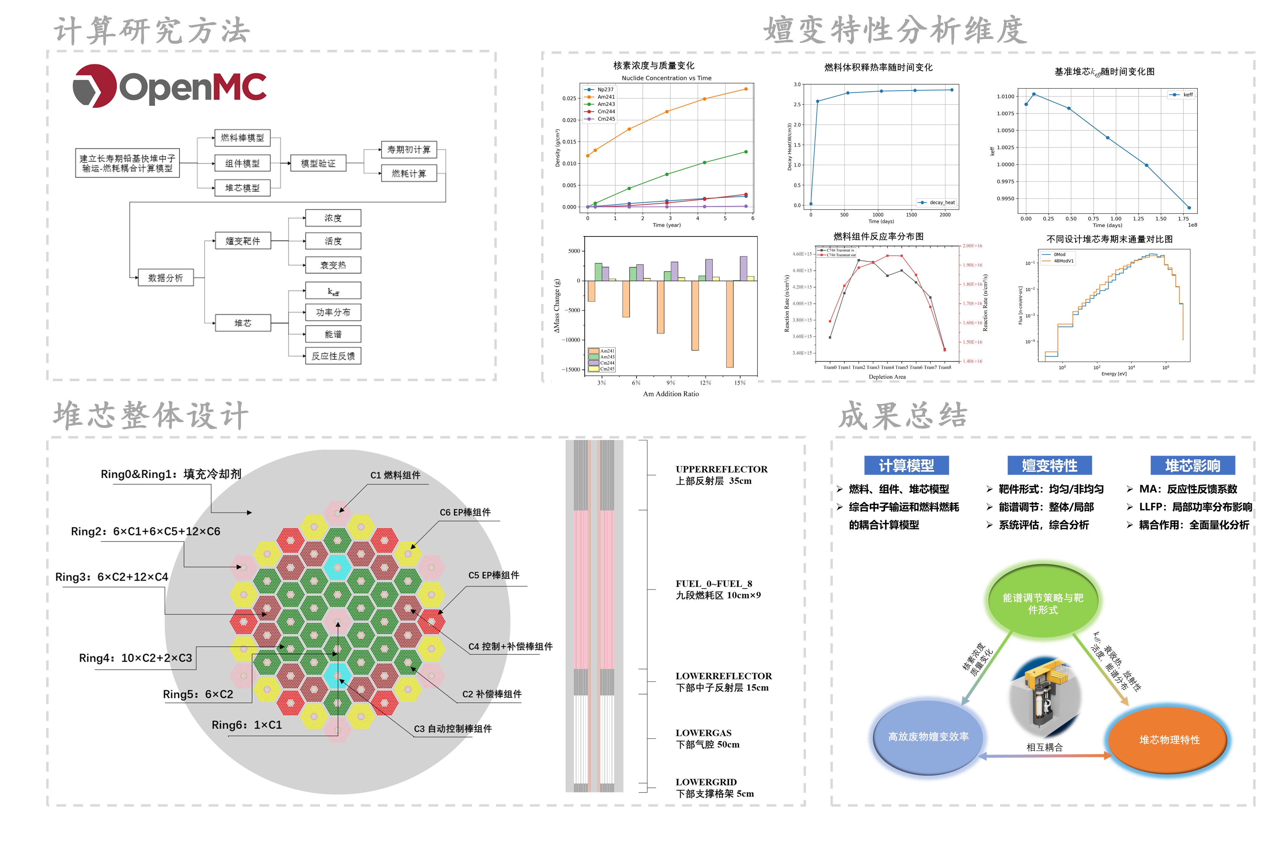 核能以其高效、清洁的特点成为重要的能源选择,但乏燃料中高放射性废物(次锕系核素MA和长寿命裂变产物LLFP)的长期危害是其广泛应用的主要障碍。铅基快堆作为第四代核能系统的核心堆型之一,不仅具有优异的本征安全性和燃料利用率,还能够通过嬗变技术减少高放废物,降低长期辐射危害,提升核燃料循环效率。因此,本项目聚焦于铅基快堆中的MA和LLFP嬗变特性及其对堆芯性能的影响,研究不同靶件形式、慢化与非慢化调节策略及嬗变过程对堆芯整体性能的复杂耦合作用。