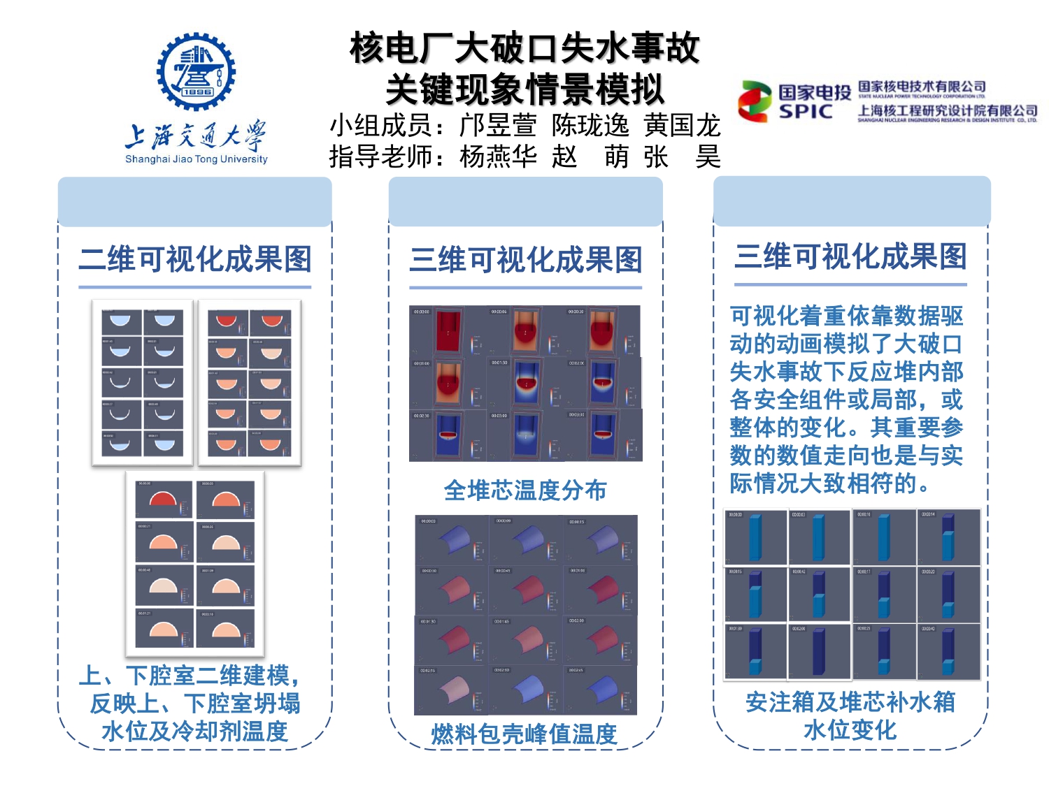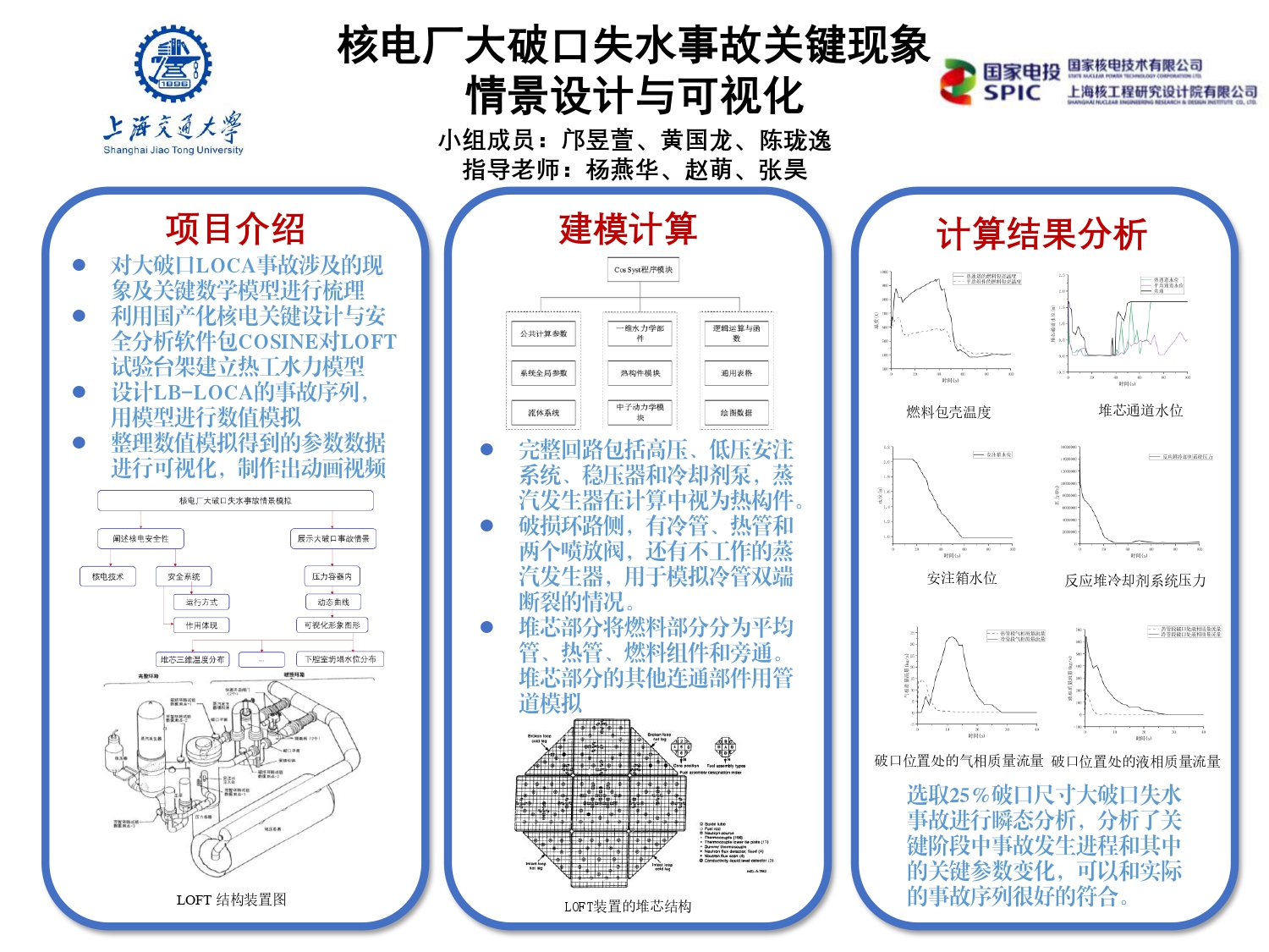 本项目的目标是对大破口失水事故堆芯燃料棒-冷却剂传热过程进行可视化描述,并完成一部重点展现大破口失水事故过程的科普视频。本项目基于国产核电站进行分析,计划利用安全分析软件对冷却剂通道建立模型,对冷却剂的压力、温度、流量,以及燃料棒包壳温度进行数值模拟,得到适用于不同工况下的模型。作为科普视频,具体呈现的几个重要环节包括核电厂总体简介、一回路设备介绍、安全注入系统简介、压力容器内部堆芯结构、发生的初因事件以及后续的事故序列、部分堆芯参数变化情况、压力容器内部环节以及最后对核电安全保护措施的说明。