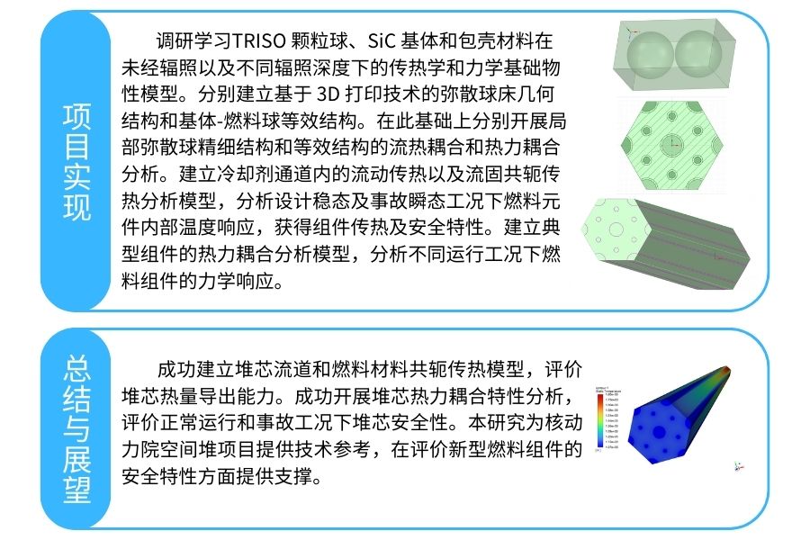 基于 3D 打印技术的异形结构反应堆设计,其传热和力学性能与传统棒状燃料构成的堆芯或固态堆芯不同,本项目从多尺度、多物理场开展传热和力学分析以明确异形结构反应堆在正常运行和事故条件下的热量导出能力及热应力变化,评价其安全性。
