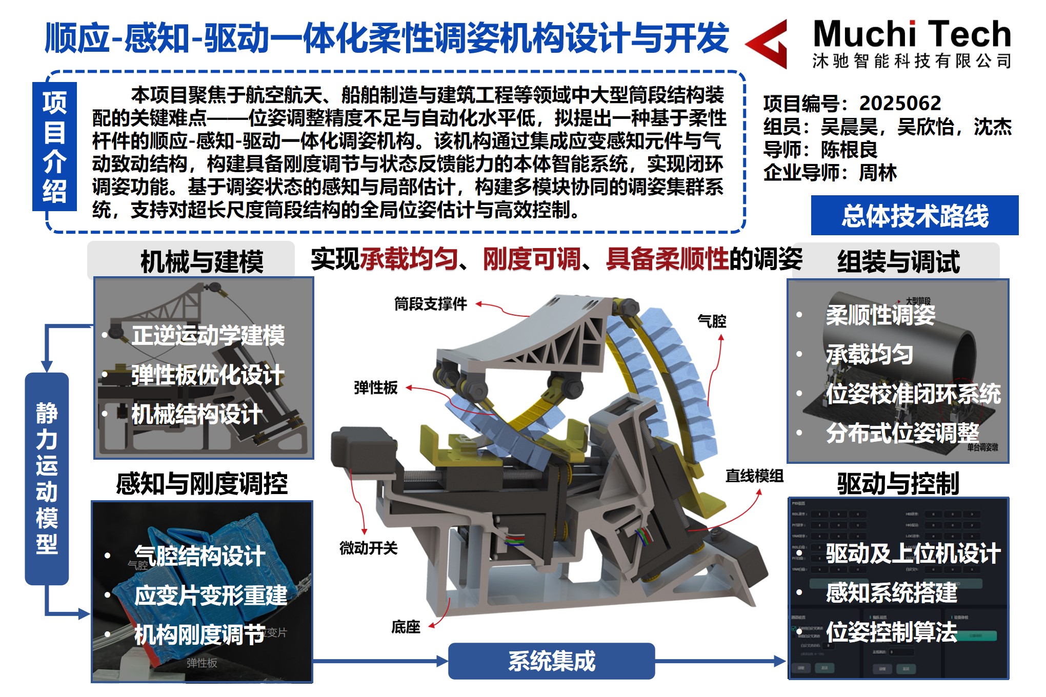 本项目设计并开发了一种顺应-感知-驱动一体化的柔性调姿机构,由四个单台调姿墩协同完成调姿任务。单台调姿墩包含了柔性杆件、气腔、应变片、直线模组和筒段支撑件等主要结构。通过读取应变片的数据可以获取弹性板的变形状况,可以计算得到支撑件上所承受的力,同时可以通过控制模块调节气泵和直线模组的输出量,实现刚度的调控和单台墩调姿机构位姿的调节。最终将通过四台调姿墩的协同控制实现大型筒段的调姿功能。
