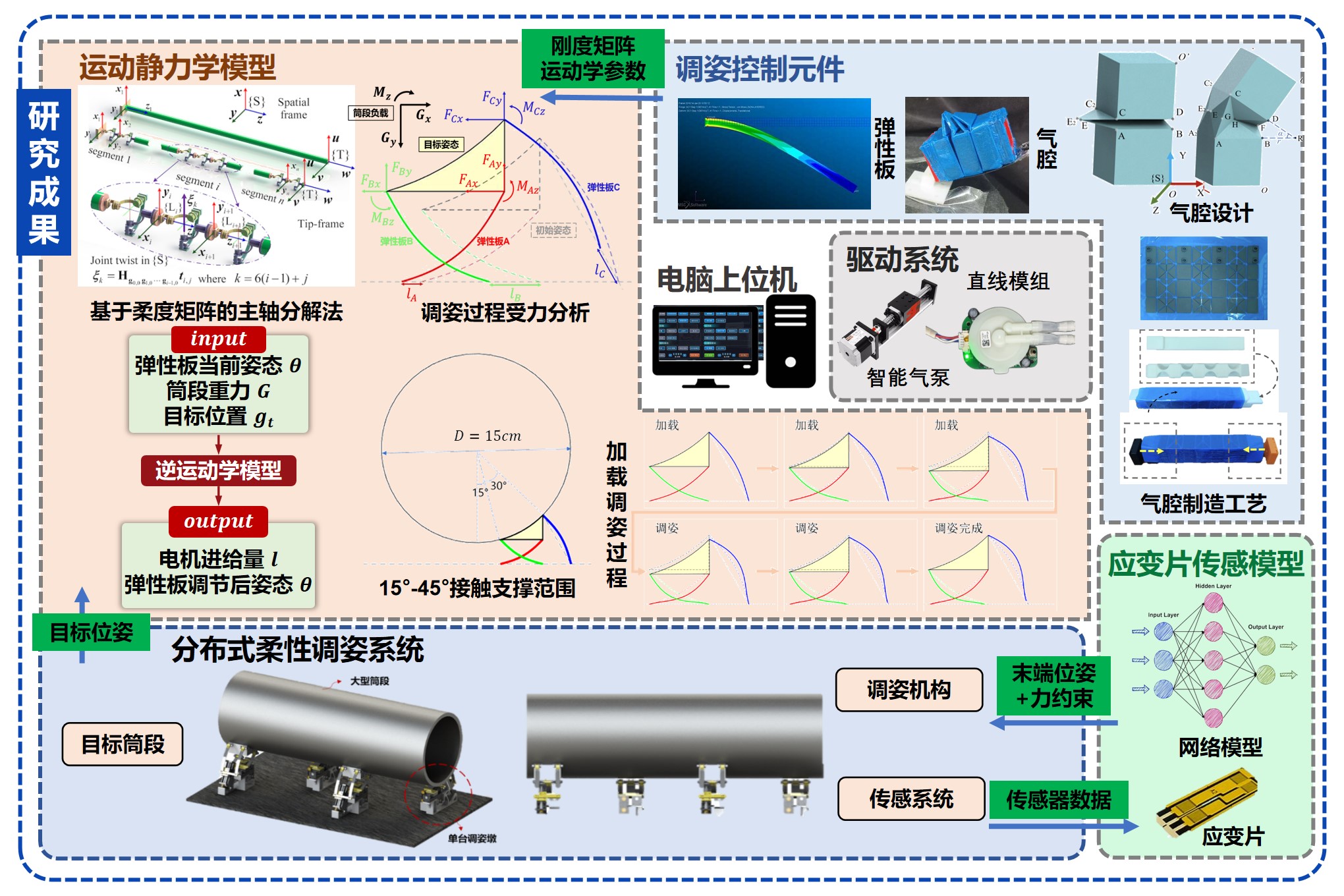 本项目聚焦于航空航天、船舶制造与建筑工程等领域中大型筒段结构装配的关键难点——位姿调整精度不足与自动化水平低,拟提出一种基于柔性杆件的顺应-感知-驱动一体化调姿机构。该机构通过集成应变感知元件与气动致动结构,构建具备刚度调节与状态反馈能力的本体智能系统,实现闭环调姿功能。基于调姿状态的感知与局部估计,构建多模块协同的调姿集群系统,支持对超长尺度筒段结构的全局位姿估计与高效控制。