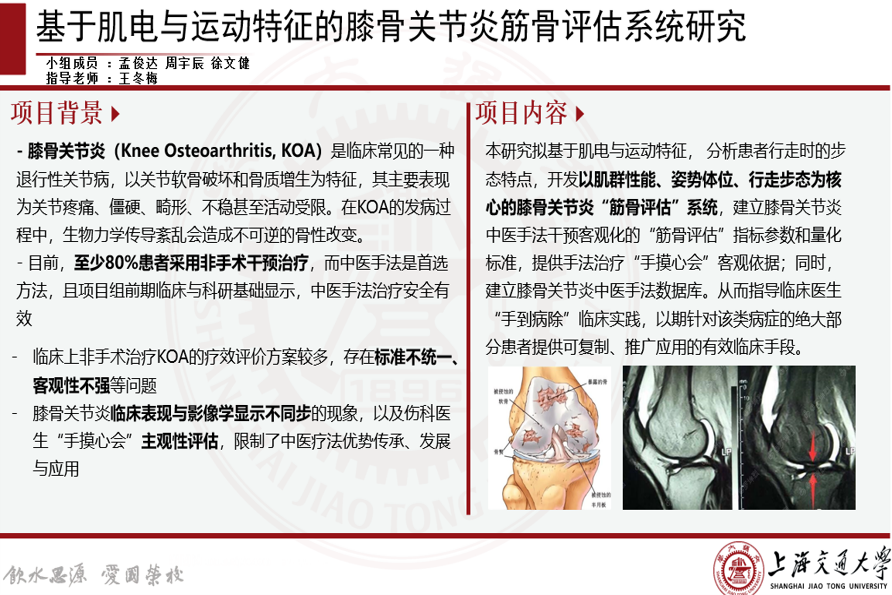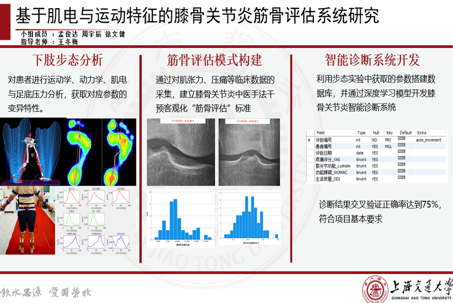 本项目对膝骨关节炎患者进行了运动学、动力学、肌电、足底压力分析,建立了骨骼肌肉系统动力学分析模型,分析了肌力与运动的协同特性,同时获取了膝骨关节炎患者的步态特性参数,以及和正常人之间的参数变异特性,为客观诊断膝骨关节炎提供理论依据;通过临床采集肌张力、压痛、姿势体位等数据,建立了膝骨关节炎中医手法干预客观化“筋骨评估”指标参数和量化标准;开发了以肌群性能、姿势体位、行走步态为核心的膝骨关节炎智能“筋骨评估”系统,建立了膝骨关节炎中医手法数据库。