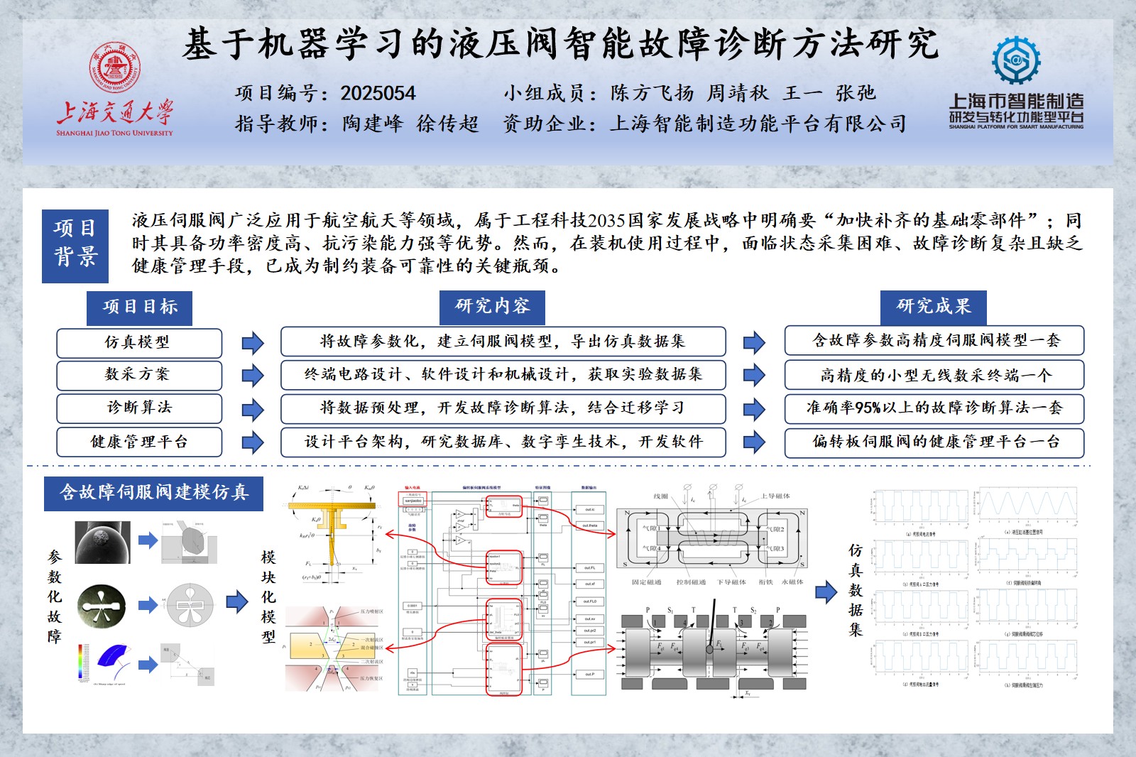 偏转板伺服阀作为电液伺服系统的核心控制元件,其运行状态直接关系到系统的性能和可靠性,高精度、智能化的故障诊断与健康管理至关重要。然而,传统方法因依赖有限的可测信号和人为经验,难以实现对复杂工况下伺服阀的精准监测。因此,本项目开展了偏转板伺服阀高精度建模、实验数据采集、智能诊断算法开发及智能健康管理平台的系统研究,旨在全面提升伺服阀的状态感知、精准诊断与智能管理能力,从而有效保障液压系统的安全与可靠运行。