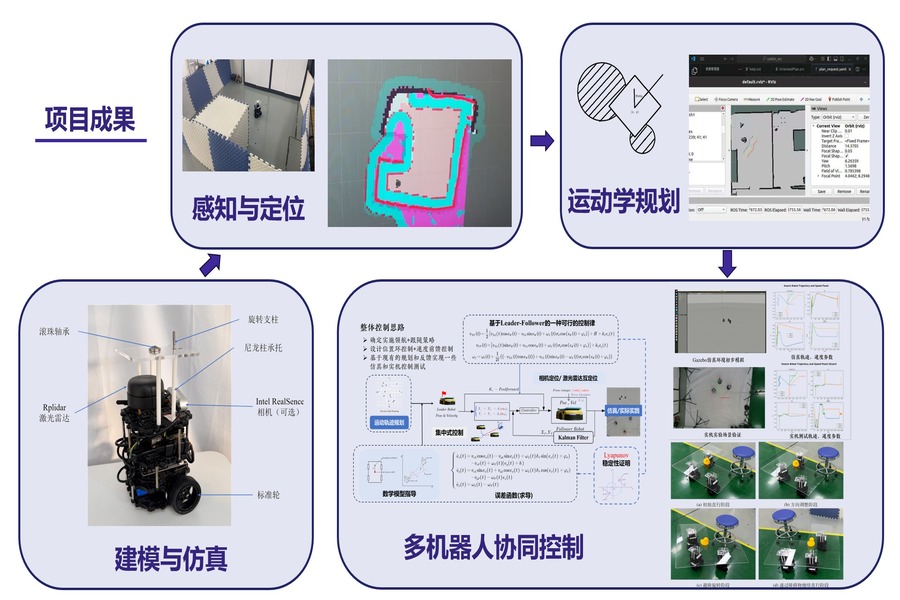 项目首先构建双轮差速驱动的AGV的动力学模型,设计建模并制造模块化可旋转式承托结构;结合ROS与Gazebo仿真平台,开发相应算法并验证,实现机器人基于RPLIDAR A2 360°激光扫描测距雷达的环境感知与高精度建图定位、多机器人互定位、基于栅格地图的路径规划导航、动态环境下多机器人编队控制。最终目标为构建一套高效、稳定、可扩展的多机器人协同搬运系统,并在仿真环境与实际场景中完成算法测试和搬运任务测试。