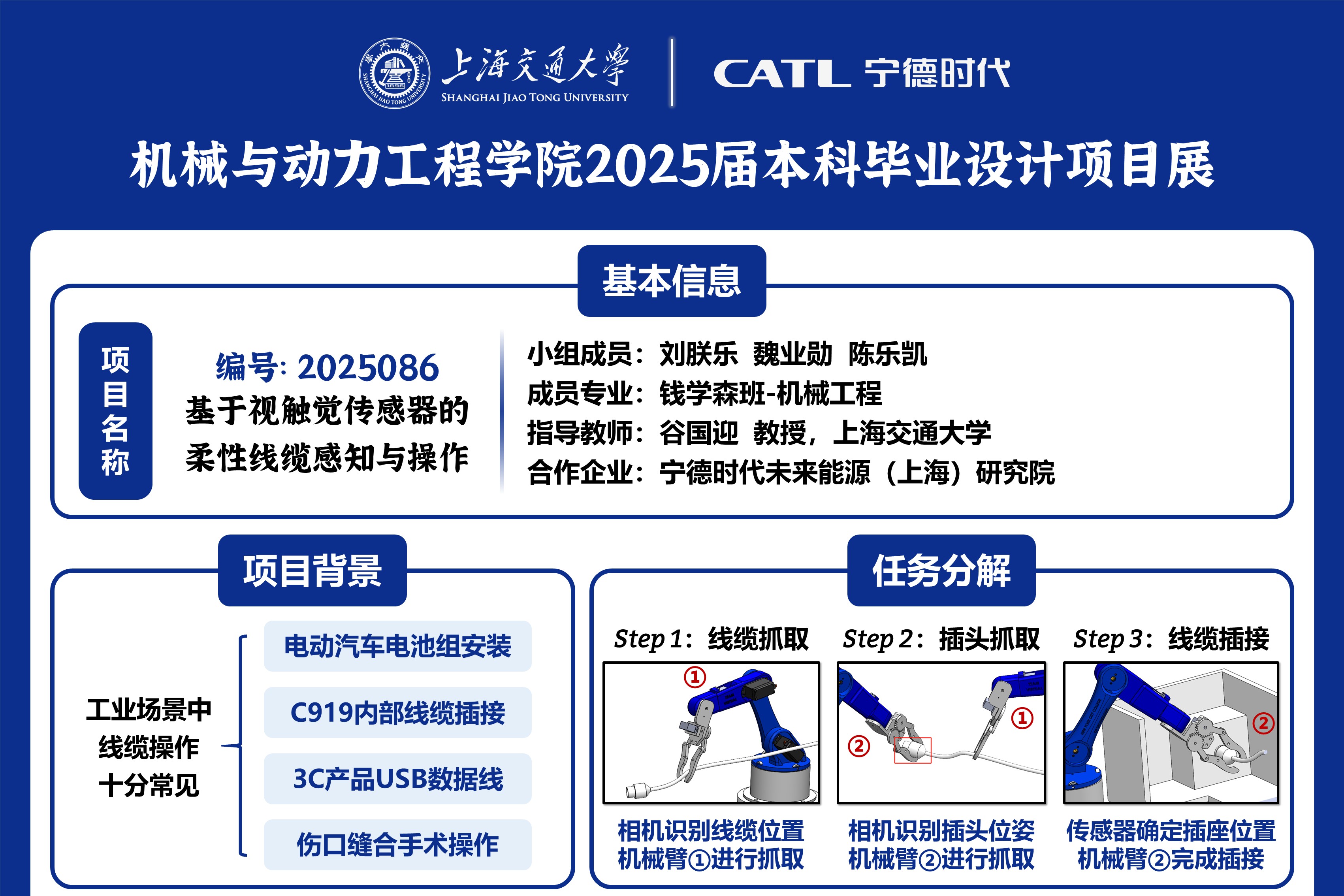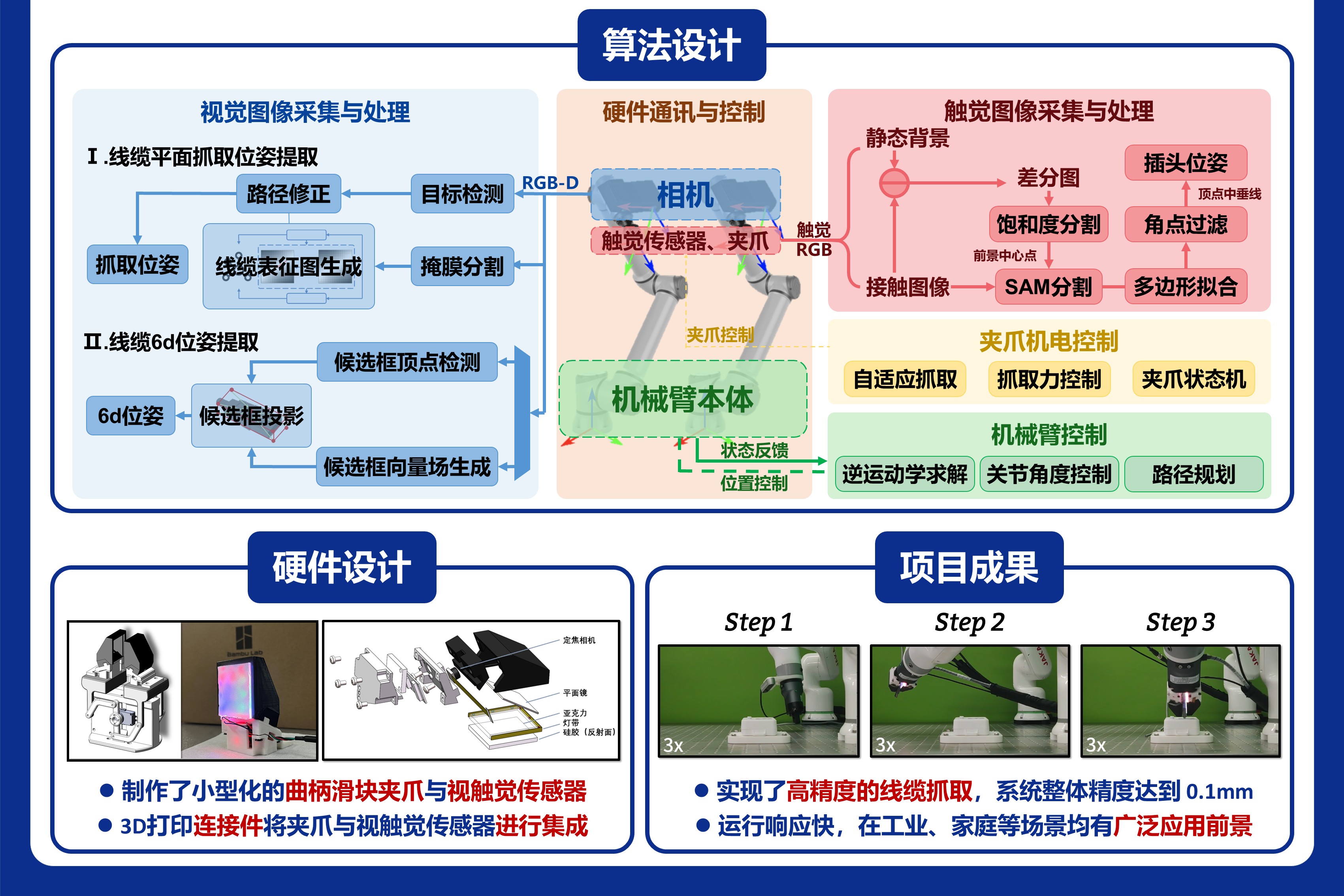 (3)机电系统集成:优化夹爪结构与双臂协同架构,满足狭小空间作业需求(如电池模组内部线缆插接),最终构建可部署的工业级原型系统。项目同时注重技术通用性,确保方案可扩展至其他柔性物体操作任务。