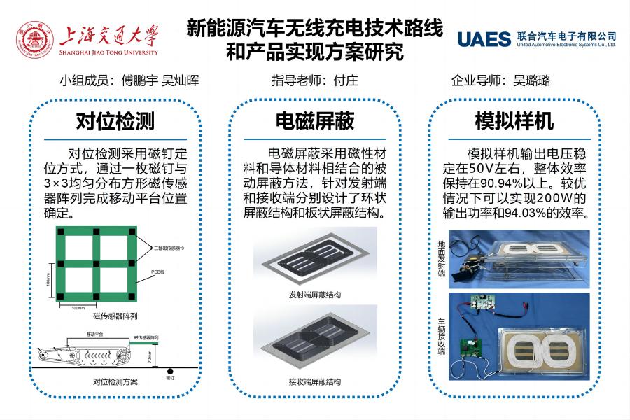 本项目完成了各模块的优化、设计、制造、加工和装配,最终完成了一台模拟样机的实物制造,并且实现了模拟样机的无线充电过程,能量传输性能、对位检测精度、电磁屏蔽效果均满足项目预期,实现了200W功率,最高效率94.03%的无线能量传输,为新能源汽车无线充电系统提出了一套可能的最优方案。