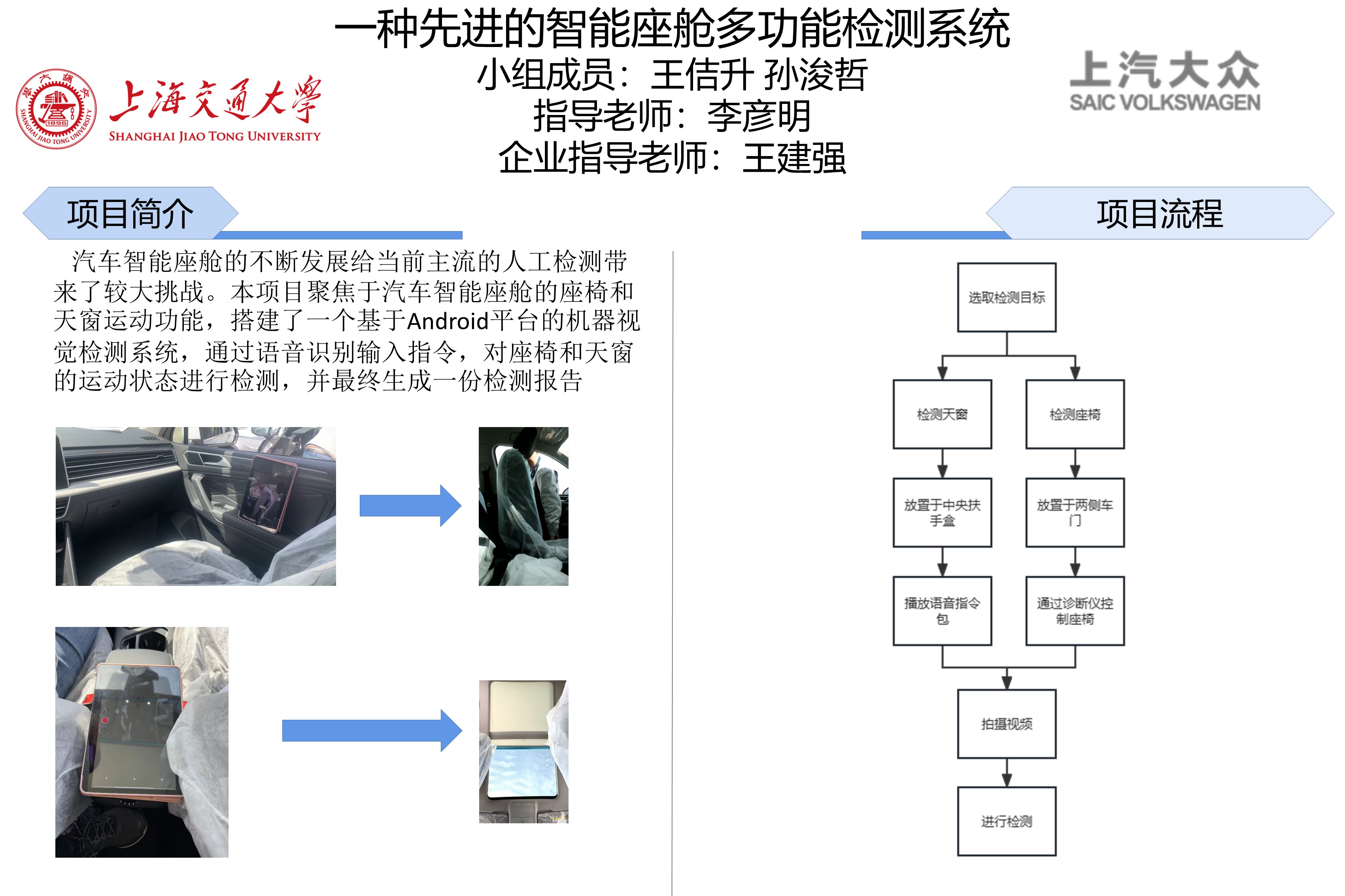项目实现了使用安卓平板的程序对天窗和座椅的运动进行动态识别的功能,能够识别天窗和座椅的位置、运动情况,并进而判断天窗的运动情况是否正常,随后向用户输出一份检测报告。项目也实现了预期的语音识别功能,可以识别使用者的语音输入指令,并且能够据此发出指令控制天窗和遮阳板的运动。