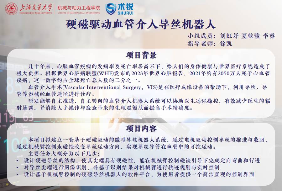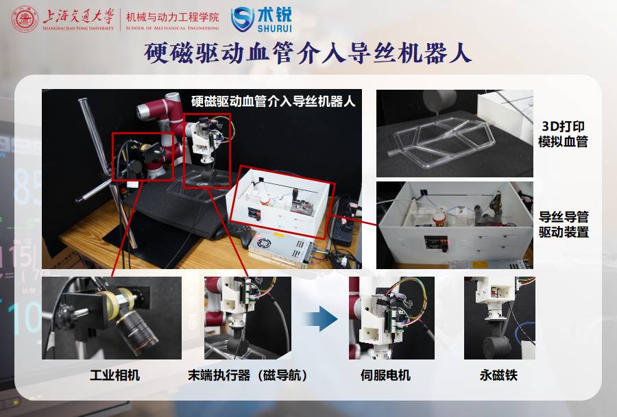 本项目设计并研发了一套基于硬磁驱动的微型导丝机器人系统,通过电机驱动控制导丝的推进与收回,通过机械臂控制永磁铁改变导丝运动方向,实现导丝导管在血管中的可控运动;基于视觉识别结果,对机械臂进行轨迹规划,实现机械臂与导丝机器人协同运动控制;通过研发基于机械臂控制的硬磁导丝机器人的软件平台,为使用者提供一个简洁直观、易于使用的控制界面。最后进行手术原理验证,测试导丝机器人在体外复杂腔道内运动,并能够应用于医学试验及手术过程。