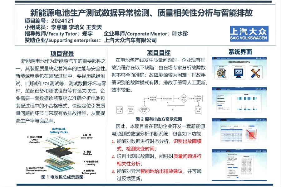 建立了基于时序聚类的时序异常模式识别模型和基于自适应滑动时间窗的突变检测模型;建立了基于故障传递链的质量问题溯源模型;分别基于朴素贝叶斯-决策树和BP神经网络建立了装配气密测试和EOL测试的智能排故模型;完成了最终系统的前后端开发任务,形成了新能源电池测试数据分析诊断专家系统。