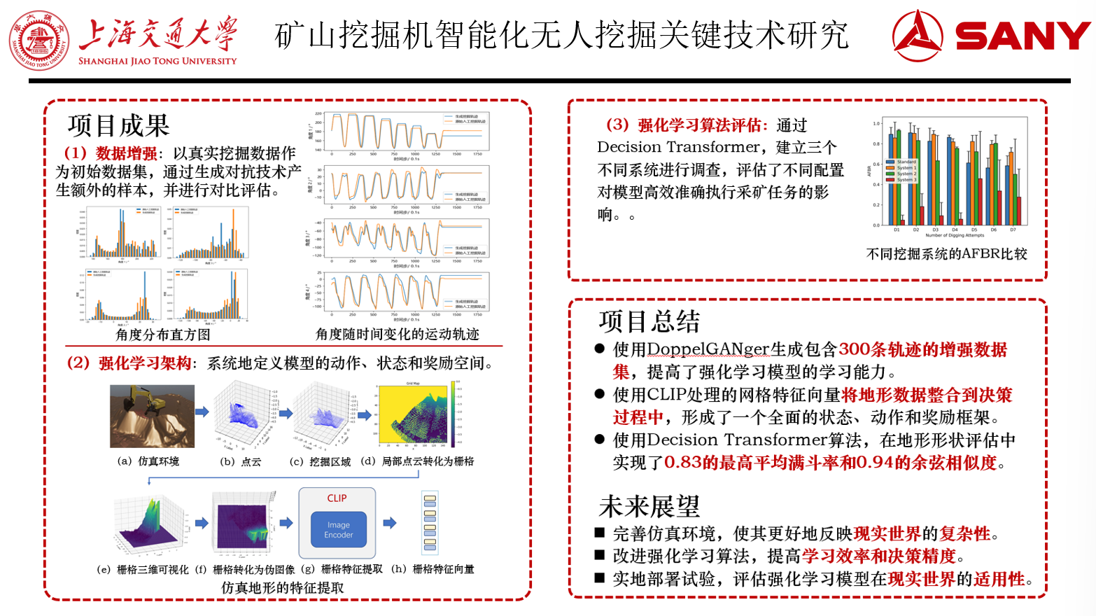 本项目通过使用DoppelGANger生成包含300条轨迹的增强数据集,提高了强化学习模型的学习能力。使用CLIP处理的网格特征向量将地形数据整合到决策过程中,形成了一个全面的状态、动作和奖励框架。使用Decision Transformer算法,在地形形状评估中实现了0.83的最高平均满斗率和0.94的余弦相似度。此研究不仅提出了建筑机械自动化的新解决方案,还为在复杂环境中应用强化学习提供了新的视角。本项目强调了结合增强数据集和详细地形特征以提高挖掘自动化效率和可靠性的潜力,并为进一步研究提供了坚实的基础。