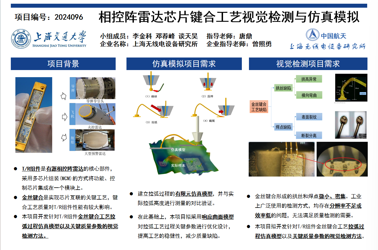 T/R组件是有源相控阵雷达的核心部件,采用多芯片组装(MCM)的方式将功能、控制芯片集成在一个模块上。而金丝键合是实现芯片互联的关键工艺,键合工艺质量对T/R组件性能有较大影响。同时,由于金丝键合形成的拱丝和焊点具有微小、密集的特点,因此工业上广泛使用的检测方法均存在分辨率不足或效率低的问题,无法满足质量检测的需要。针对以上两种需求,本项目开发了T/R组件金丝键合工艺拉弧过程仿真模型以及关键质量参数的检测方法。