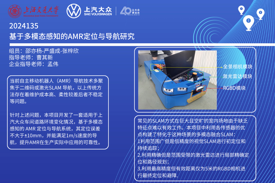 项目拟开发一套适用于上汽大众车间道路环境变化情况,基于多模态感知的自主导航移动机器人(AMR)定位与导航系统。要求其定位误差不大于±10mm,并能满足1m/s速度的导航,满足上汽大众工业生产的需要,并提升AMR在生产实际中应用的可靠性。