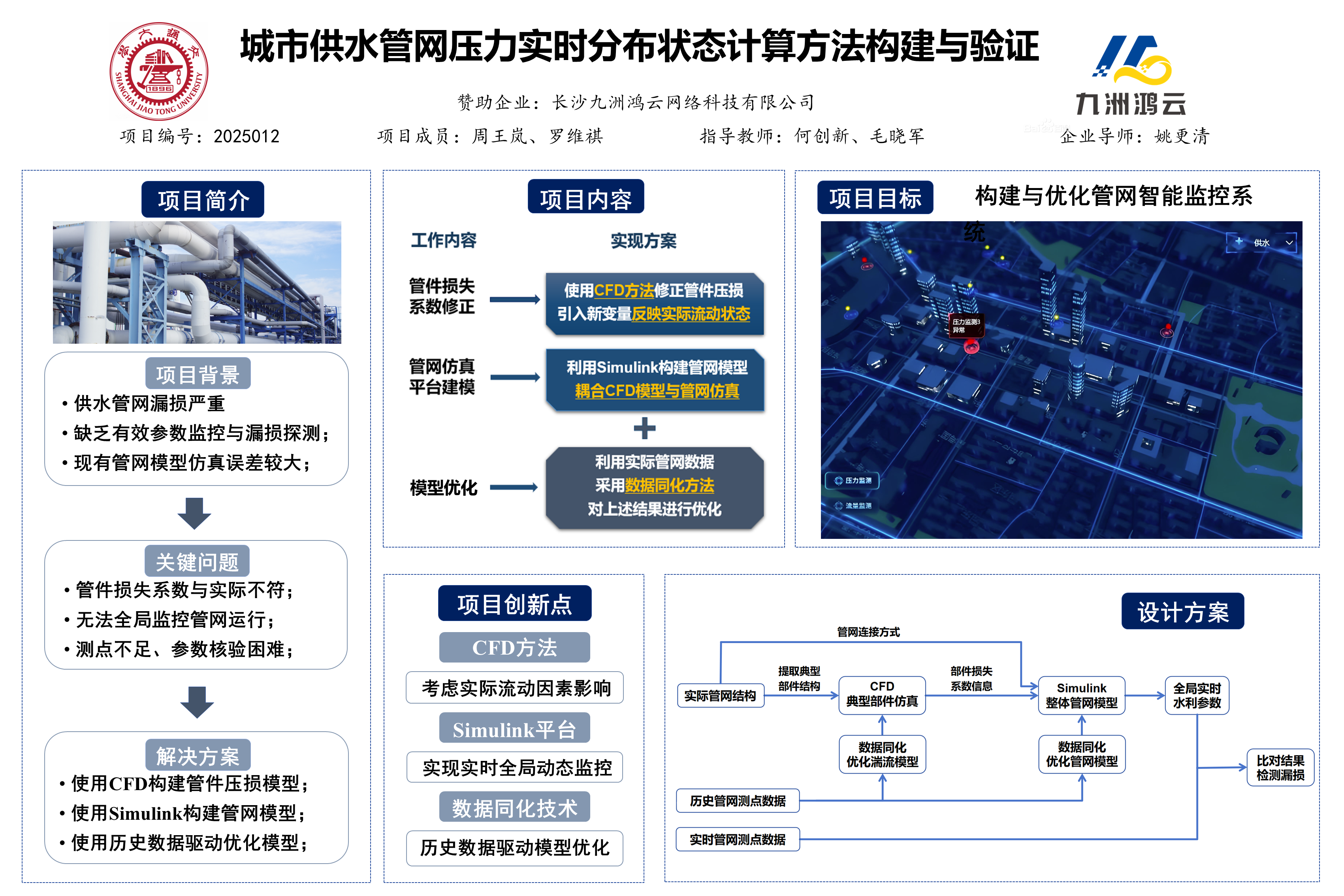 该项目结合企业层面智慧泵站与城市供水一体化智慧管理的需求期望构建实现针对城市管网系统完成全局动态压力监测与漏损反馈的仿真计算平台。通过CFD方法构建典型管道部件仿真,基于Simulink仿真平台构建整体管网模型,并从CFD计算结果中提取多种部件的损失系数信息提供给Simulink管网模型,用以替换损失系数的经验公式,提高计算准确度;同时利用数据同化方法,以实际管网数据驱动,优化湍流模型和整体管网模型参数,使仿真计算结果贴合实际管网工作状态。