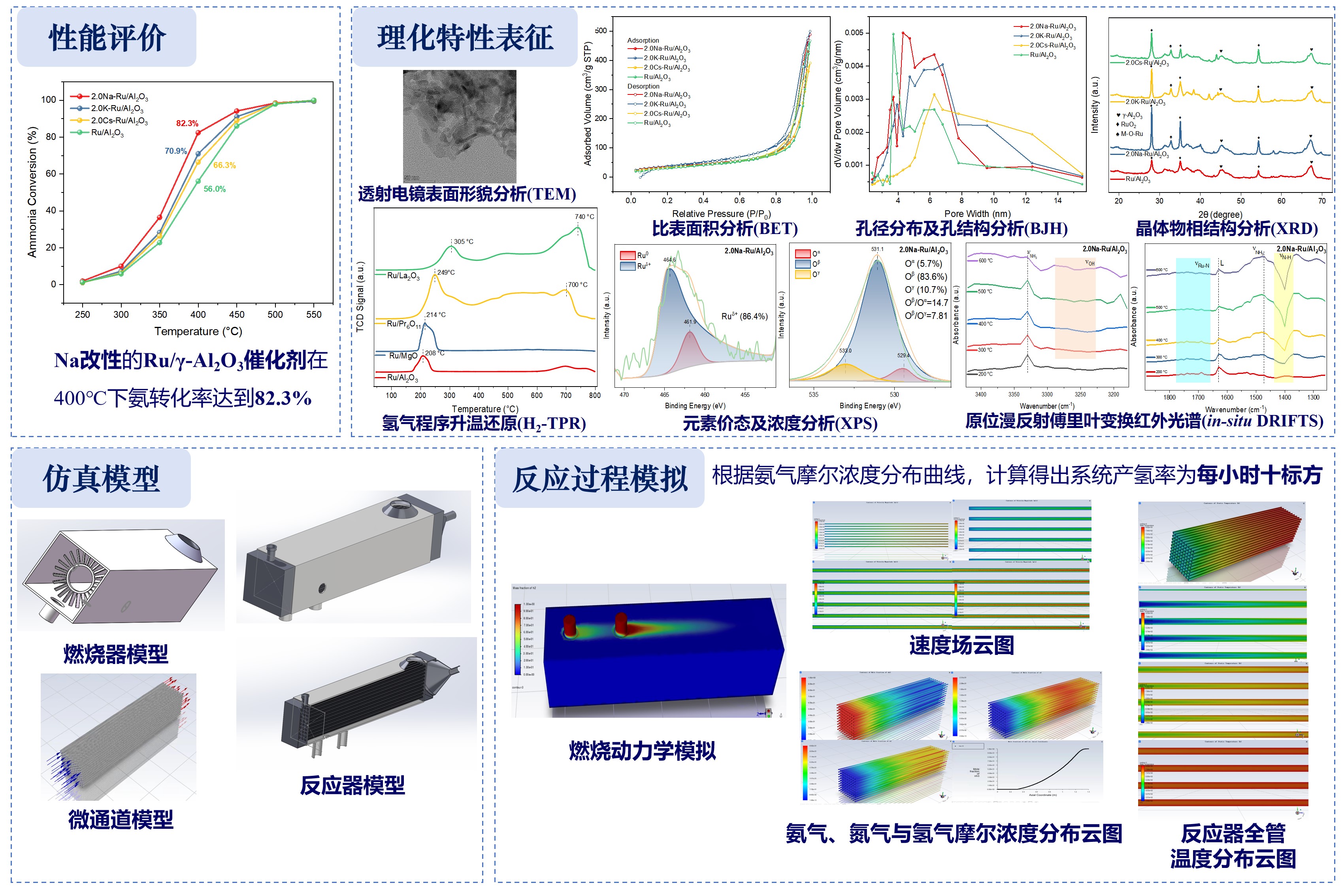 1. 已开发Na改性的Ru/Al2O3催化剂,在400℃下的氨转化率达82.3%,并对催化剂样品进行了理化特性表征,获取了相关的形貌特征和物种特性;