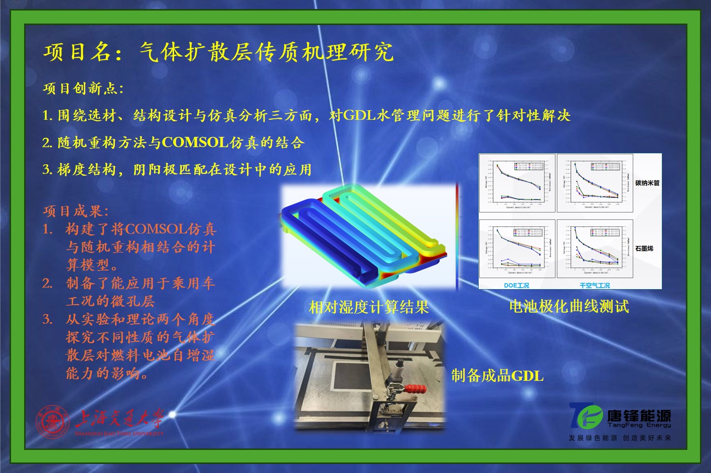 在微孔层设计方面,通过对碳材料的物性表征,配方的优化和改进,最终制备出了性能最佳的微孔层。并通过电池极化测试与湿度敏感测试,验证了制备出的气体扩散层在乘用车工况下极化性能良好,在怠速点与额定点运行时能够维持较高的功率,具有较好的湿度适应性。