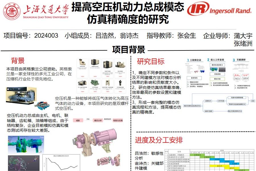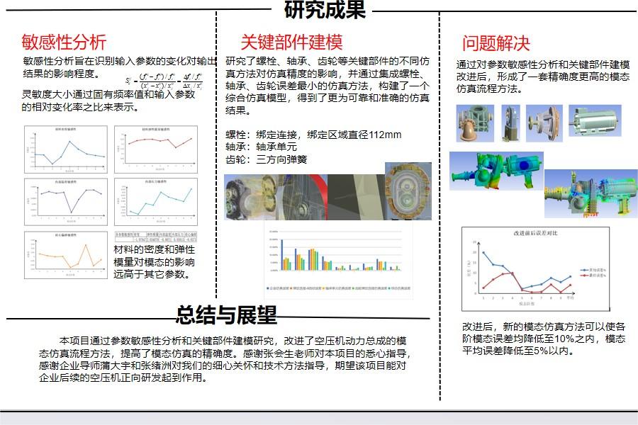 空压机是一种能够将低压气体转化为高压气体的动力设备,因其特殊功能在制冷设备、机械制造和国防军工等领域均有广泛应用。空压机在运行过程中不可避免存在振动问题,空压机动力总成由主机、电机、联轴器、齿轮箱、油箱等组成,由于结构复杂,企业目前模态仿真和实验测试间存在较大差距。本项目希望能够识别清楚影响动力总成模拟仿真结果准确性的影响因素及其贡献度大小,并能够建立提高准确度的仿真技术。