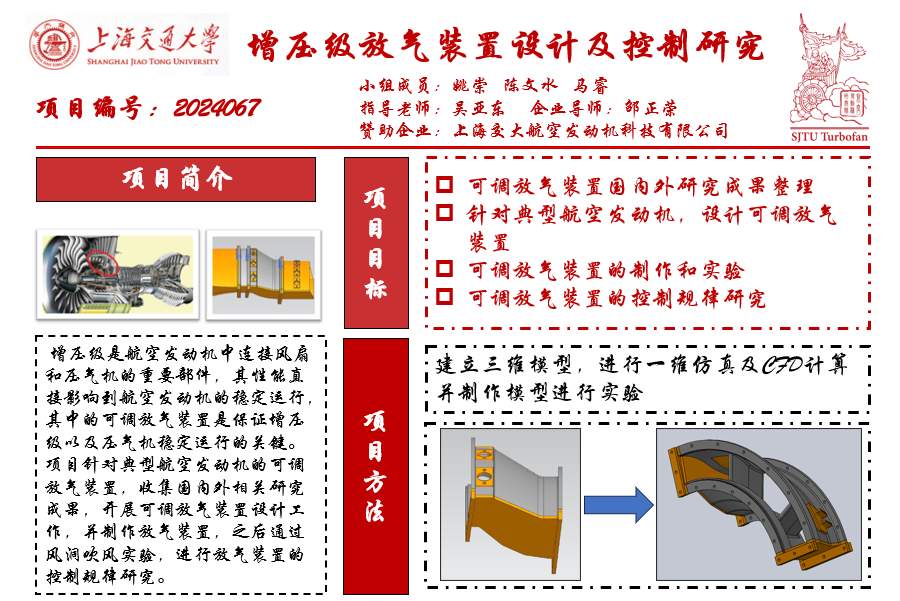 本项目要求对增压级可调放气装置的国内外相关研究成果进行查阅与调研,并基于国内外现有的可查询的专利和论文情况,分析现有的增压级放气装置的优点与不足;在此基础上选取合适的增压级放气装置模型,设计放气活门的开启方式,构建合适的实验模型并制作;构建CFD计算模型,进行不同工况下的数值计算,得到不同工况下的增压级流场变化;构建数学模型,进行一维仿真,并针对典型工况进行实验,研究放气活门的控制规律。