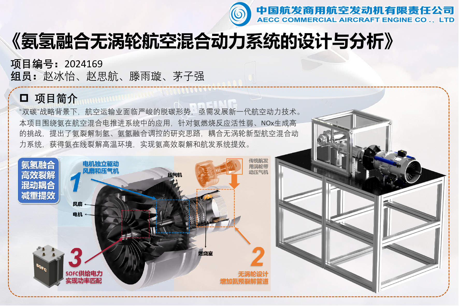 “双碳”战略背景下,航空运输业面临严峻的脱碳形势,亟需发展新一代航空动力技术。氢能化和电气化是航空业脱碳主要路径,而全氢航空动力面临燃氢储氢两大挑战。氨因其高储氢效率已成为重要零碳燃料,同时具有储运成本低、泄露易察觉等优势。此外,动力电池能量密度低、功率密度低,导致全电动力无法满足长航程需求,涡-电混动技术被认为更为可行。本项目围绕氨在航空混合电推进系统中的应用,针对氨燃烧反应活性弱、NOx生成高的挑战,提出了氨裂解制氢、氨氢融合调控的研究思路,耦合无涡轮新型航空混合动力系统,获得氨在线裂解高温环境,实现氨高效裂解和航发系统提效。
