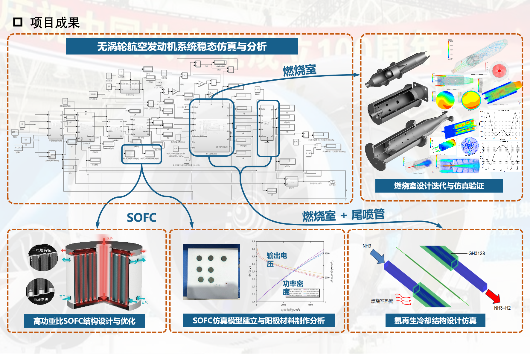3. 分别针对无涡轮航空发动机和固体氧化物燃料电池系统开展设计和模拟,构建氨气燃烧室在线裂解模型和航发整体冷却模型,形成氨氢融合无涡轮航空混合动力系统模型,并开展模型参数化分析,获得零碳航空动力创新设计思路;
