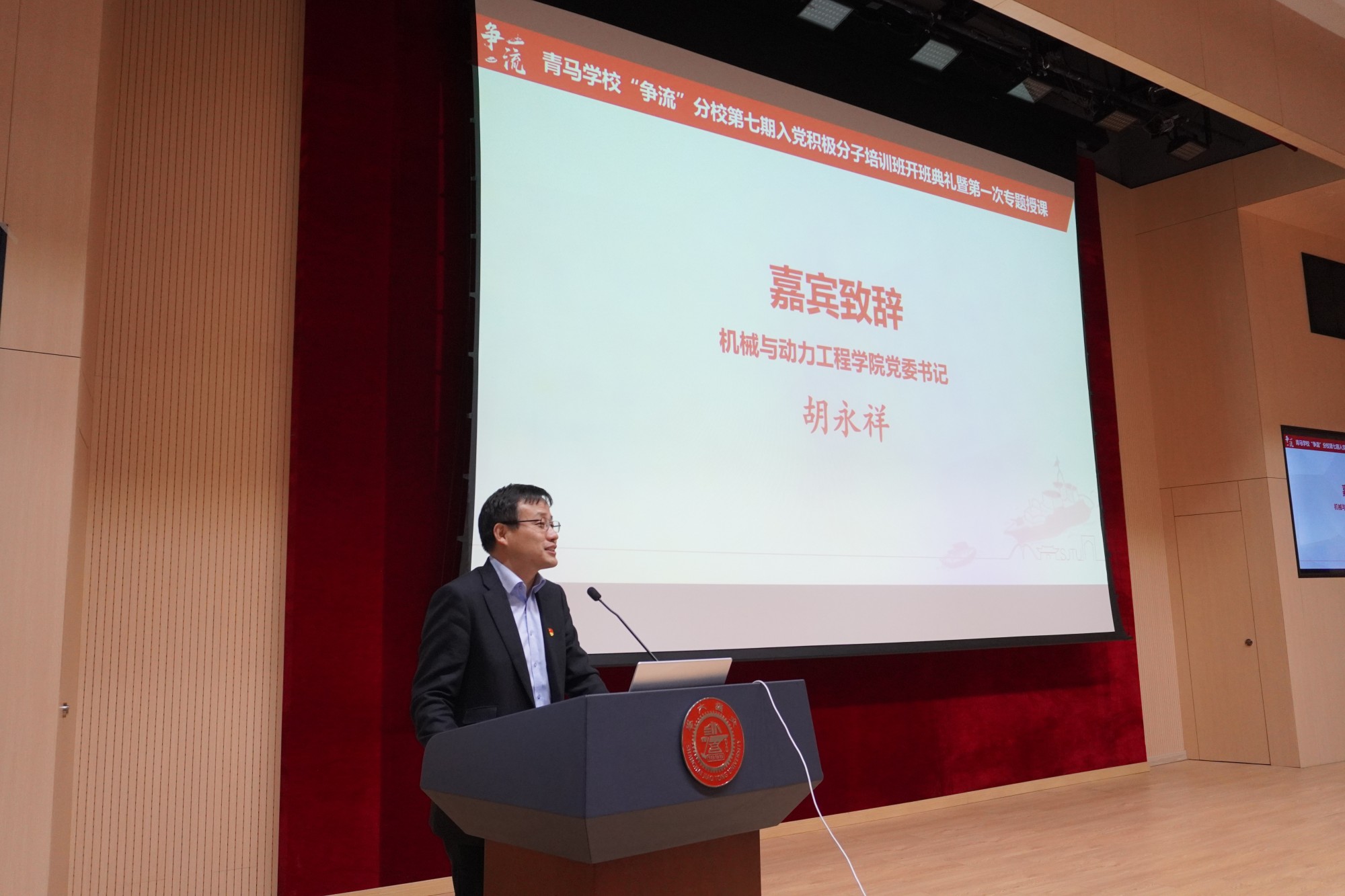 4月10日,由买球官方网站和中英国际低碳学院联合开办的青年马克思主义学校“争流”分校第七期入党积极分子培训班开班典礼举行。买球官方网站关工委副主任、党委组织部特邀党建组织员陶燕敏,买球官方网站党委书记胡永祥,以及培训班全体学员等参加了典礼。活动邀请第二届全国高校思政课教学展示“特等奖”获得者、马克思主义学院副教授孔德猛上专题党课。