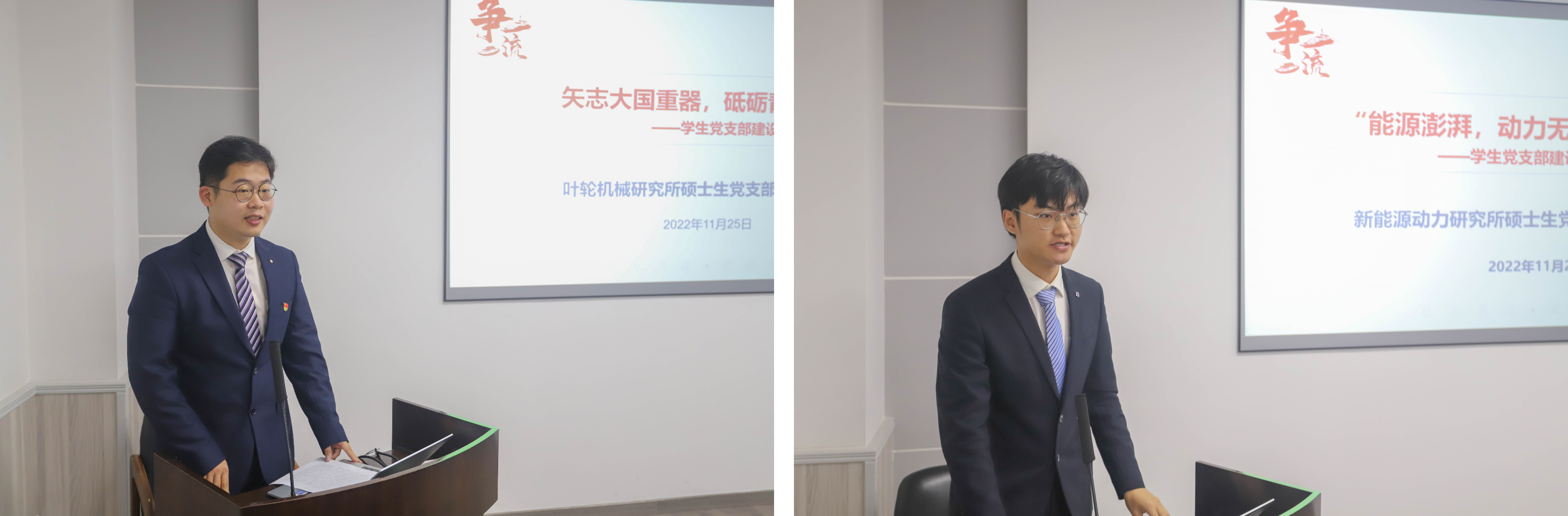 叶轮机械所硕士生党支部书记史挺以“志向”、“青春”、“砥砺”和“聚焦”四个关键词,介绍了支部瞄准“两机”重大战略,联合教工党支部将党建与科研深度融合,积极推动校企共建,实现党建与科研工作双提升的做法和经验。新能源动力研究所硕士生党支部书记房明明以“能源澎湃,动力无限,共行共建”为主题,交流了支部与清华大学、七一一研究所等相关党支部开展共行共建的情况,分享了支部建设思路。