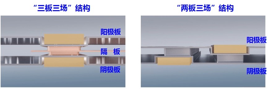 日本、欧洲企业生产的金属双极板都采用“三板三场”结构设计,即用阳极板、隔板、阴极板将氢气场、氧气场、冷却液流场隔开。能否简化这种结构,去掉隔板,改为“两板三场”?在研发早期阶段,交大团队提出了这一原创构想。“三块板的用料比较多,不仅增加了成本,而且分量也重,这样就会影响燃料电池的功率密度。”特等奖项目第六完成人、上海治臻总经理蓝树槐博士解释说。