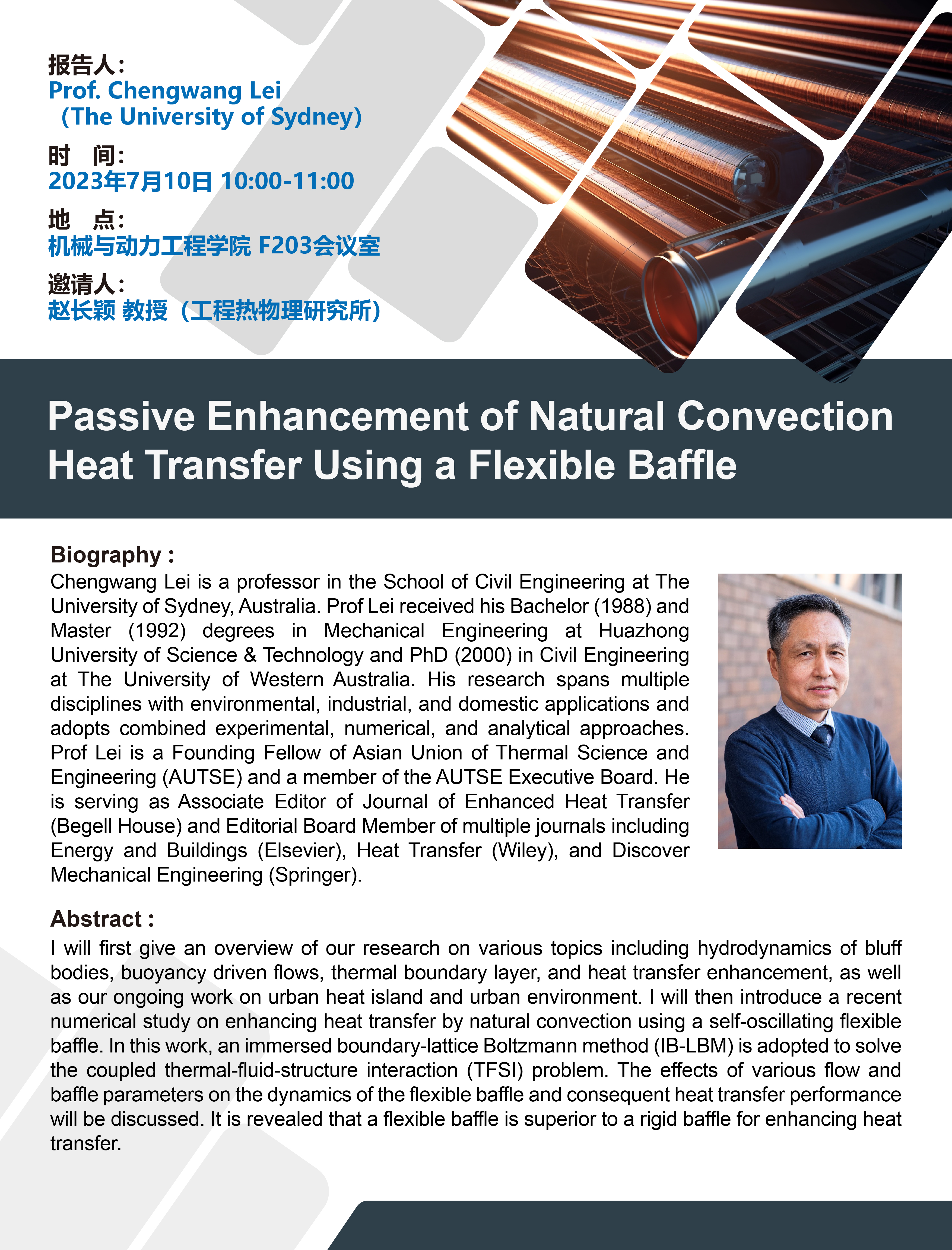 I will first give an overview of our research on various topics including hydrodynamics of bluff bodies, buoyancy driven flows, thermal boundary layer, and heat transfer enhancement, as well as our ongoing work on urban heat island and urban environment. I will then introduce a recent numerical study on enhancing heat transfer by natural convection using a self-oscillating flexible baffle. In this work, an immersed boundary-lattice Boltzmann method (IB-LBM) is adopted to solve the coupled thermal-fluid-structure interaction (TFSI) problem. The effects of various flow and baffle parameters on the dynamics of the flexible baffle and consequent heat transfer performance will be discussed. It is revealed that a flexible baffle is superior to a rigid baffle for enhancing heat transfer.