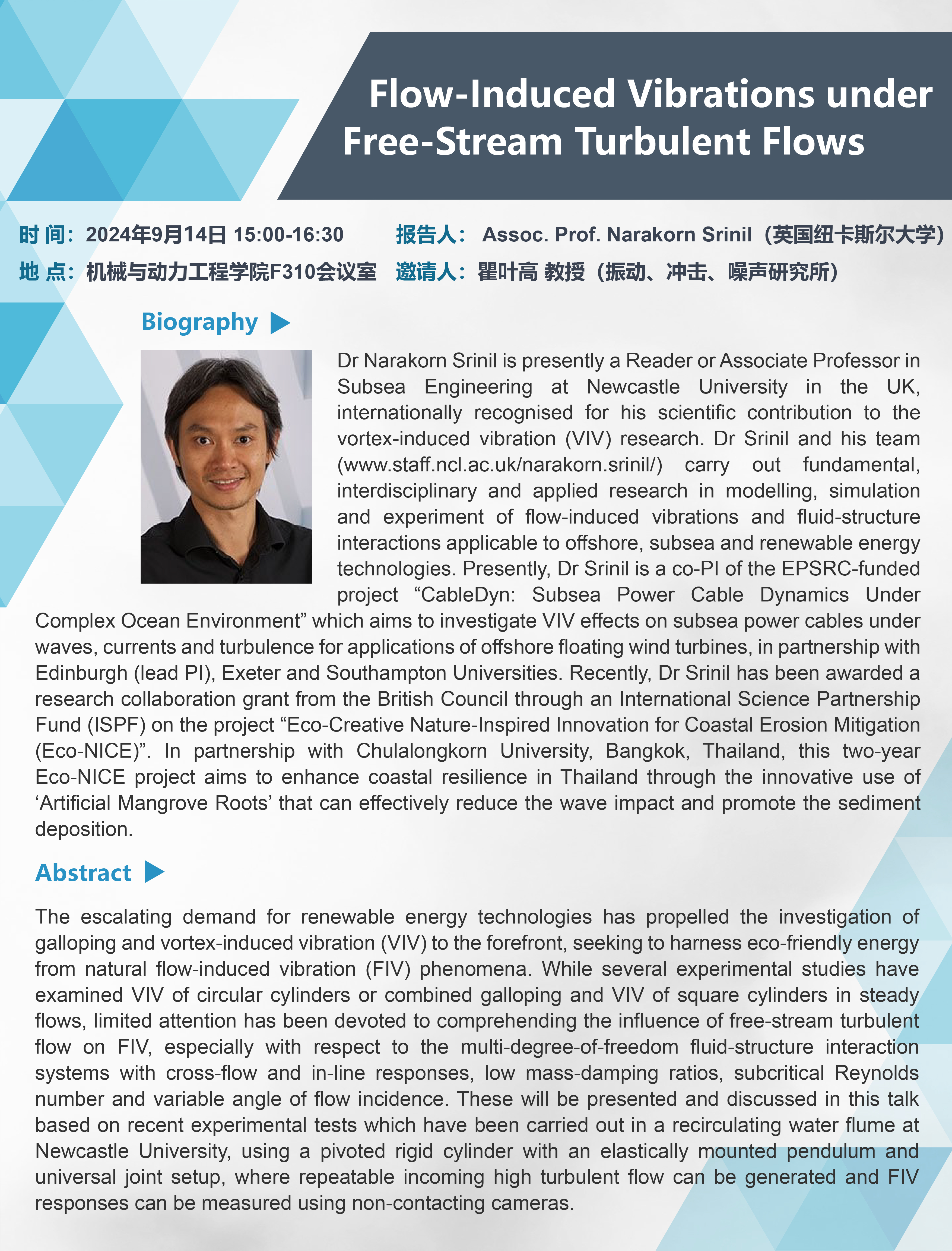 Dr Narakorn Srinil is presently a Reader or Associate Professor in Subsea Engineering at Newcastle University in the UK, internationally recognised for his scientific contribution to the vortex-induced vibration (VIV) research. Dr Srinil and his team (www.staff.ncl.ac.uk/narakorn.srinil/) carry out fundamental, interdisciplinary and applied research in modelling, simulation and experiment of flow-induced vibrations and fluid-structure interactions applicable to offshore, subsea and renewable energy technologies. Presently, Dr Srinil is a co-PI of the EPSRC-funded project “CableDyn: Subsea Power Cable Dynamics Under Complex Ocean Environment” which aims to investigate VIV effects on subsea power cables under waves, currents and turbulence for applications of offshore floating wind turbines, in partnership with Edinburgh (lead PI), Exeter and Southampton Universities. Recently, Dr Srinil has been awarded a research collaboration grant from the British Council through an International Science Partnership Fund (ISPF) on the project “Eco-Creative Nature-Inspired Innovation for Coastal Erosion Mitigation (Eco-NICE)”. In partnership with Chulalongkorn University, Bangkok, Thailand, this two-year Eco-NICE project aims to enhance coastal resilience in Thailand through the innovative use of ‘Artificial Mangrove Roots’ that can effectively reduce the wave impact and promote the sediment deposition.
