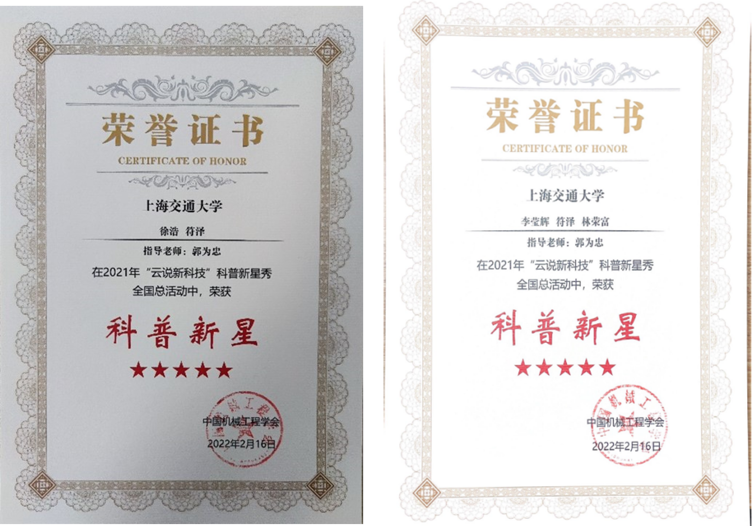 Recently, the awards of the “2021 ‘Cloud Talk New Technology’ Science Popularization New Star Show Activity” was announced. Two popular science video works, titled with “Obstacle-overcoming Expert -- Vehicle with Transformable Wheels”, and “From the Far Milky to the Star - the Magic Landing Machine for the Millennium Dream”, produced by two graduate teams from the Institute of Design and Control Engineering for Heavy Equipment, School of Mechanical Engineering led by master student Mr. Hao Xu and Ph.D. student Mr. Yinhui Li respectively, won the top level awards Science Popularization Star Show with Five Star out of 285 submitted works.