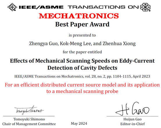 Recently, the paper entitled“Effects of Mechanical Scanning Speeds on Eddy-Current Detection of Cavity Defects”won the Best Paper Award of 2023 IEEE/ASME Transactions on Mechatronics, which was announced the 2024 IEEE/ASME International Conference on Advanced Intelligent Mechatronics (AIM). This paper was completed by the team led by Prof. Zhenhua Xiong from the Robotics Institute of School of Mechanical Engineering at Shanghai Jiao Tong University and Prof. Kok-Meng Lee at Georgia Institute of Technology. Mr. Zhengya Guo, who is a Ph.D. candidate at SJTU, is the first author. Prof. Xiong and Prof. Lee are the co-corresponding authors.