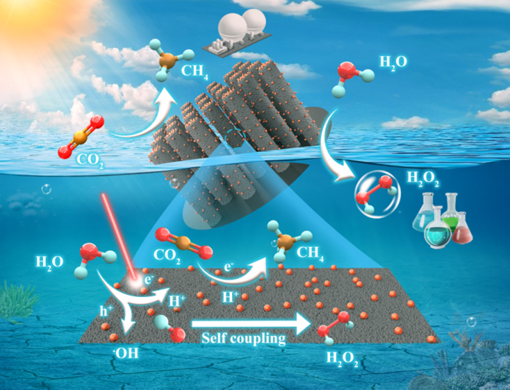 Renewable synthetic fuels are crucial for decarbonizing energy and power sectors in the future. Methane, a widely used chemical fuel, has well-established infrastructures for storage, transportation, and utilization. However, it is primarily derived from non-renewable fossil resources such as natural gas. H2O2 is an important fine chemical with extensive applications in environmental remediation, organic synthesis, pharmaceuticals, and electronics industries. Traditional processes for H2O2 production, such as the anthraquinone method, are complex and environment-unfriendly. Using solar energy to convert CO2 and water into green methane and hydrogen peroxide via artificial photosynthesis is ideal for producing carbon-neutral fuels and high-value chemicals.