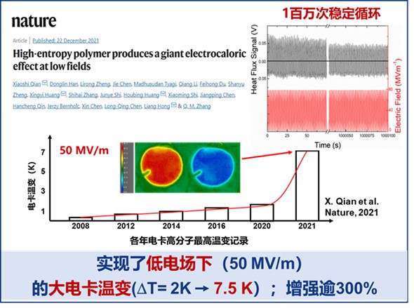 巨电卡效应是一种奇异的凝聚态物理现象,利用电介质充放电过程中的可逆电致温变组成制冷循环,逆着温度梯度输运热量。电卡制冷系统使用固态电介质作为制冷材料,功耗小、能效高,具有零温室效应潜能(GWP)、易于小型化/轻量化等特点,是热管理领域重要的颠覆性前瞻技术之一。项目在国际上首次提出了极化高熵材料设计方法,制备了一种极化高熵高分子,显著增强了其低电场下的电卡制冷能力(近400%),制冷材料循环寿命提升超过20000倍,首次了实现百万次无损循环,突破了制约领域发展的一项关键瓶颈。相关研究工作近两年发表于Nature、Science等高水平学术刊物。