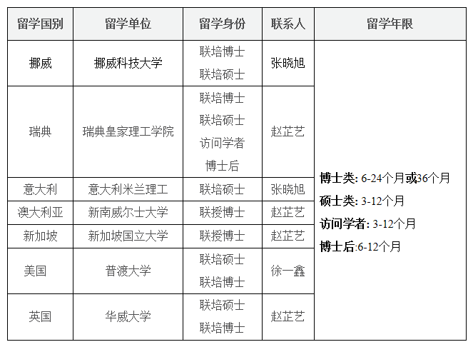 我校的国家留学基金委“可持续能源高效利用”创新人才国际合作培养项目现面向能源相关领域研究生及教师选拔人员,项目获批人员在外留学费用将由国家留学基金委按国家公派留学标准进行资助。项目依托高校间合作协议进行,可申报留学单位及拟招募对象如下: