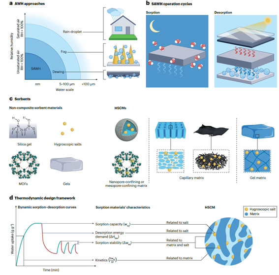 近日,买球官方网站王如竹ITEWA创新团队在Nature Reviews Materials上发表题为“Hygroscopic salt-embedded composite materials for sorption-based atmospheric water harvesting”的综述论文,从热力学角度分析了用于空气取水的吸湿盐掺杂复合吸附剂中吸湿性盐、水和盐溶液之间的相互作用关系,建立了吸湿盐类型与含量、孔隙结构和基质承载能力等结构参数与最终材料性能之间的联系,总结性地提出了指导吸附剂吸附量、解吸焓、动力学和稳定性的理论设计框架,为空气取水及相关领域中吸附材料的设计提供统一验证与调控新方法。买球官方网站-新加坡国立大学联授学位博士生山訸为论文第一作者,王如竹教授、新加坡国立大学陈瑞深副教授为通讯作者。