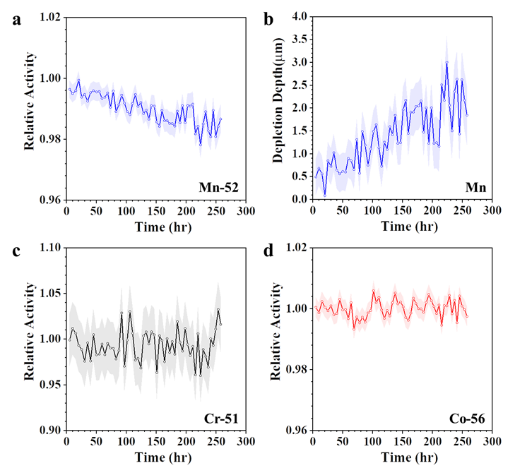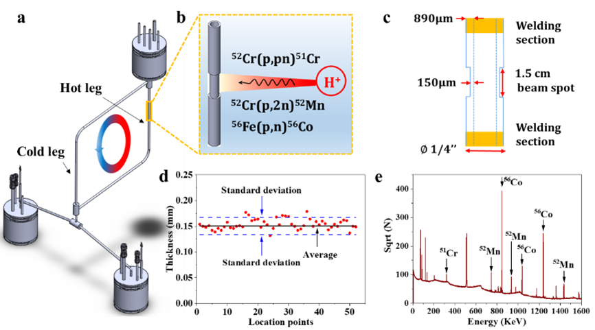 高温熔盐具有运行温度高、工作压力低、传储热性能强、成本低及化学性能稳定等优点,在高温熔盐堆、乏燃料干法后处理、太阳能光热、可再生能源存储等领域得到了广泛应用。然而,高温熔盐环境结构材料腐蚀严重,已成为制约其应用前景的重要因素之一。目前,由于技术水平的限制,流动熔盐环境中材料的腐蚀机理和腐蚀产物流动机制尚未揭示。针对以上问题,研究提出了一种基于放射性核素示踪技术的原位腐蚀及腐蚀产物输运监测方法,用于研究316L不锈钢(316L SS)在NaCl-MgCl2共晶熔盐自然循环回路中的腐蚀特性。该方法采用16MeV质子对热端管道进行回旋加速器辐照,从而在熔盐与合金界面产生放射性核素51Cr、52Mn和56Co。通过测量这些放射性核素在回路管道不同位置的放射性活度变化,实现了316L SS腐蚀侵蚀深度的原位监测,以及腐蚀产物在流动NaCl-MgCl2熔盐中传输和沉积的实时追踪。