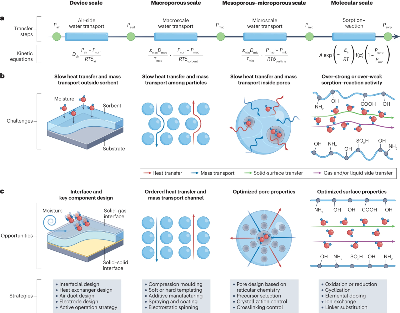 近日,上海交大买球官方网站ITEWA创新团队在Nature Reviews Materials上发表题为“Sustainable Moisture Energy”的Perspective论文,从热力学、传热传质学、反应动力学等视角对湿度诱导能源收集这一新兴技术进行了分析研究,评估了该技术在全球不同气候工况下的湿度诱导制冷/制热/发电的产能潜力,为该领域的能源材料热设计构建与能源器件研发提供了新思路。制冷与低温工程研究所博士后许嘉兴为论文第一作者、博士生王鹏飞为共同第一作者,李廷贤研究员为通讯作者,王如竹教授与清华大学曲良体教授为共同通讯作者。该论文入选Nature Reviews Materials期刊亮点论文。