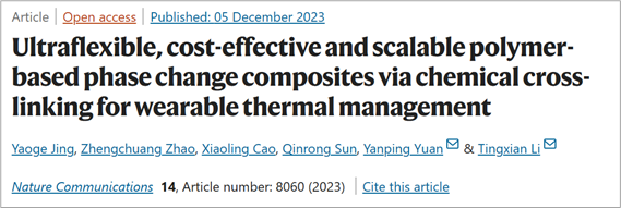 近日,上海交大买球官方网站ITEWA团队在国际期刊Nature Communications上发表了题为“Ultraflexible, cost-effective and scalable polymer-based phase change composites via chemical cross-linking for wearable thermal management”的研究论文。该论文由制冷与低温工程研究所ITEWA团队与西南交通大学团队合作完成,为规模化制备柔性定形相变储热复合材料和可穿戴的热管理器件提供了新思路。制冷与低温工程研究所博士后赵正创和西南交通大学硕士研究生敬瑶阁为论文共同第一作者,李廷贤研究员和西南交通大学袁艳平教授为共同通讯作者,王如竹教授对该工作给予了指导和建议。