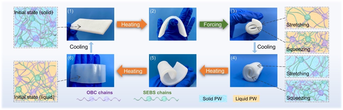 研究人员成功制备了超柔性定形相变储热复合材料PW@OBC-SEBS,将相变材料PW嵌入C-C键强化的SEBS-OBC双聚合物网络结构,实现了相变材料的定形封装,可以在加热-冷却循环条件下维持良好的热稳定性和柔性特征。通过化学反应路径分析和实验测试,研究发现该化学交联方法合成的储热复合材料相对传统物理混合技术制备的复合材料,展现出显著的聚合物化学交联增韧效应和热稳定性,断裂伸长率达560%。该材料经过500次循环试验后仍保持稳定的柔性功能,且在高于相变温度的热空气和热水环境下具有稳定的定形效果而不出现液体泄漏,相变焓值高达176 kJ/kg,具有优异的储热能力。