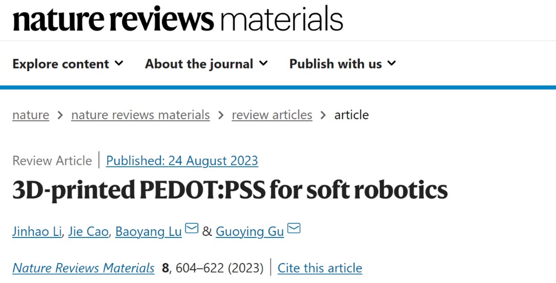 近日,买球官方网站买球官方网站谷国迎教授团队在Nature Reviews Materials上发表“3D-printed PEDOT:PSS for soft robotics”综述文章,针对3D打印技术制造PEDOT:PSS导电聚合物材料应用于软体机器人领域进行了系统分析与前瞻展望。上海交大买球官方网站博士研究生李金昊为论文第一作者,江西科技师范大学硕士研究生曹杰为共同第一作者,谷国迎教授、江西科技师范大学卢宝阳教授为共同通讯作者。