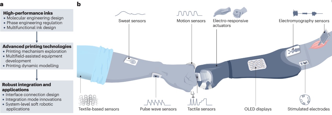 未来展望:(a)3D打印PEDOT:PSS未来方向;(b)软体机器人领域中的前瞻应用