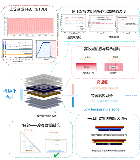 由于工业化的进程与全球性的气候变化,目前全球仍有超过四十亿人面临着严峻的饮水危机。另一方面,大气中蕴藏着极为丰富的水蒸气,水含量大约相当于地球表面河流总量的6倍,如何大量且高效地提取出空气中的水蒸气,并将其以液态水的方式收集成为一个前沿问题。基于吸附式空气取水技术借助吸附剂实现低湿度下的水蒸气吸附以及低品位热源(如太阳能)的脱附,最终可以实现将大气中丰富的水蒸气转化为可直接饮用的液态水。虽然目前已有的研究初步展现了空气取水技术的可行性,但是研究中使用了较多电力驱动的辅助装置以增强系统表现,这在一定程度上忽视了以沙漠为代表的离网使用场景的实际使用条件。另一方面,高性能MOF吸附剂的扩大化合成也是这一技术扩展的一个重要障碍。研究基于吸附式空气取水技术,形成了一整套“材料-器件-装置”的综合技术方案,提出了扩大化低成本合成高性能MOF吸附剂Ni2Cl2(BTDD)的技术方案以及与之配套的模块化紧凑式太阳能空气取水机组。