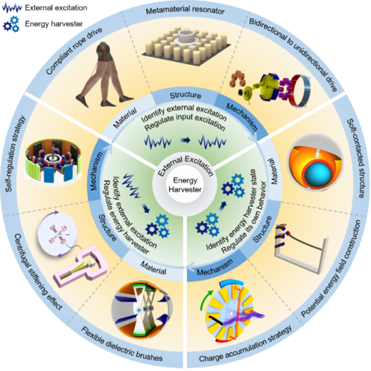 论文明确了机械智能能量采集的定义:能量采集系统能够识别外部激励或自身状态并作出反应,而不依赖于电气元器件实现自适应或程序化功能,使外部激励满足系统要求,或系统的动力学行为与机电转换机制相匹配。因此,它可以减少系统对传感器和复杂控制系统的依赖性,简化系统的复杂性,提高系统的输出功率、电能质量、环境适应性、鲁棒性和可靠性。特别是对于微小型器件来说,机械智能可以简化复杂的系统,促进微型化器件设计和制造,实现更优越的性能。从能量采集效率的角度来看,机械智能能量采集系统有助于实现“开源节流”的目标。虽然在不同形式的机械能之间进行转换可能会消耗一定的能量,但从总体能量采集系统中看,机械智能使能量采集系统从环境中捕获更多的机械能,实现“开源”的效果。同时,它还可以降低机电转换和电路处理过程中的能量损失,实现“节流”的效果,从而提高整个系统的机电转换效率。基于机械智能能量采集的设计原理,该系统的设计方法可分为识别外部激励并调控输入激励、识别外部激励并调控能量采集系统、识别能量采集系统的状态并调控自身行为三类。