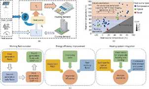 (a) 热泵的工作原理 (b)热泵的性能总结;(c) 热泵发展方向