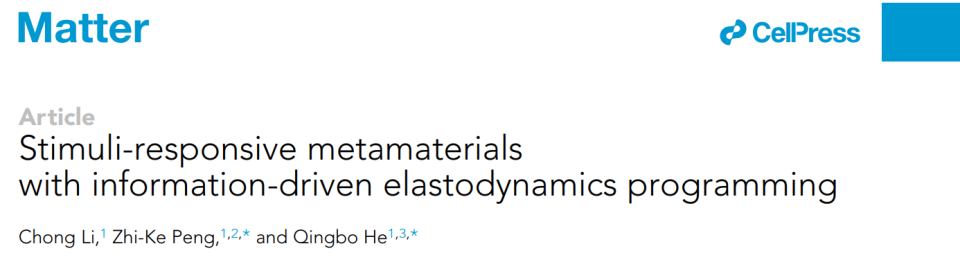 近日,上海交大机械系统与振动国家重点实验室何清波教授、彭志科教授团队在Cell姊妹刊Matter上在线发表了题为“Stimuli-responsive metamaterials with information-driven elastodynamics programming”的研究论文,提出了信息驱动的弹性动力学编程概念,创造了一种结构振动感知信息的新方式。论文的第一作者是博士生李崇,通讯作者是彭志科教授和何清波教授。