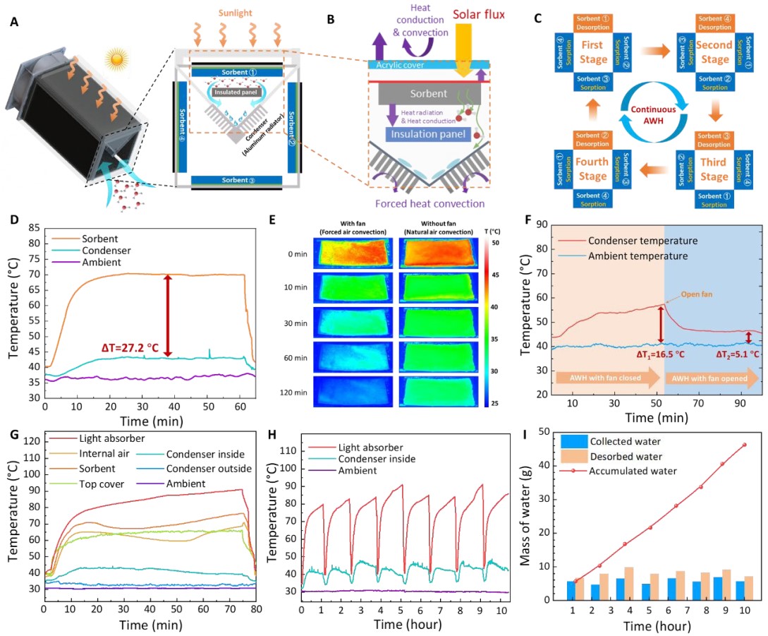 文章从吸附材料开发与合成、材料与器件传热传质强化、空气取水装置循环工作策略设计等多个角度对空气取水进行了全面的创新与性能提升,提出了一种垂直阵列的石墨烯水凝胶复合吸附材料(LiCl@rGO-SA),设计构建了可实现快速连续循环的新型空气取水装置,通过吸附材料和取水装置的创新突破实现了太阳能驱动的超高空气取水量。