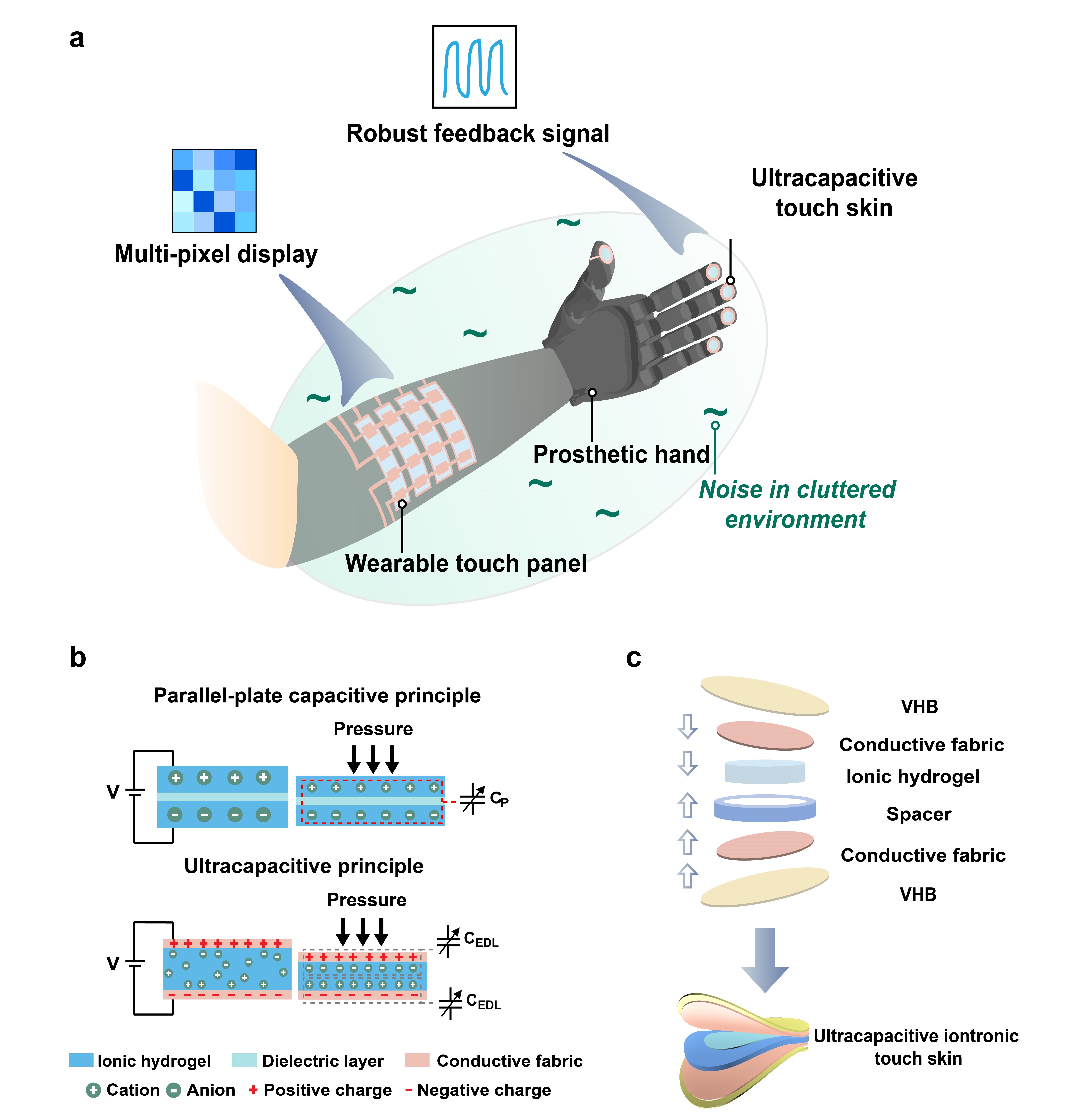 近日,上海交大买球官方网站机器人研究所朱向阳教授、谷国迎教授团队联合美国卡耐基梅隆大学的Carmel Majidi教授在Advanced Materials期刊上提出了一种高灵敏的柔性离子凝胶压感皮肤,利用超高电容机理,实现了超宽的压力检测范围、快速响应时间、高电容基线(nF-μF级)和高信噪比,在生理信号监测、多点传感阵列、残疾人软体假肢手触觉反馈等领域取得了实际应用。论文“Cutaneous Ionogel Mechanoreceptors for Soft Machines, Physiological Sensing, and Amputee Prostheses” 第一作者是机器人研究所博士研究生沈泽群。