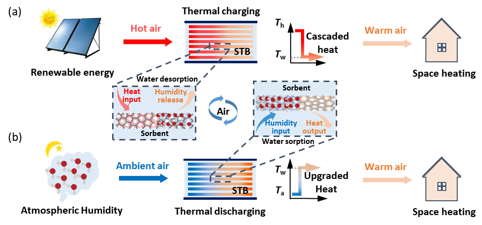 论文作者提出了基于水蒸汽吸附/解吸从空气中取能的吸附热池,储热阶段,利用热空气驱动吸附热池的吸附剂发生解吸反应,将热空气的显热以吸附剂-水的吸附势能形式存储在吸附热池,同时热空气温度从Th降至Tw,然后通过热能的梯级利用实现向外界的供热;放热阶段,冷空气流过吸附热池驱动水分子与吸附剂发生吸附反应,利用吸附剂-水吸附反应释放的吸附热将冷空气从Ta加热至Tw,通过热能的品位提升实现向外界的供热。相比于传统储热装置的间断运行,吸附热池结合储热过程的热能梯级利用与放热过程的热提质利用,可提高能源利用效率和实现连续供热输出。